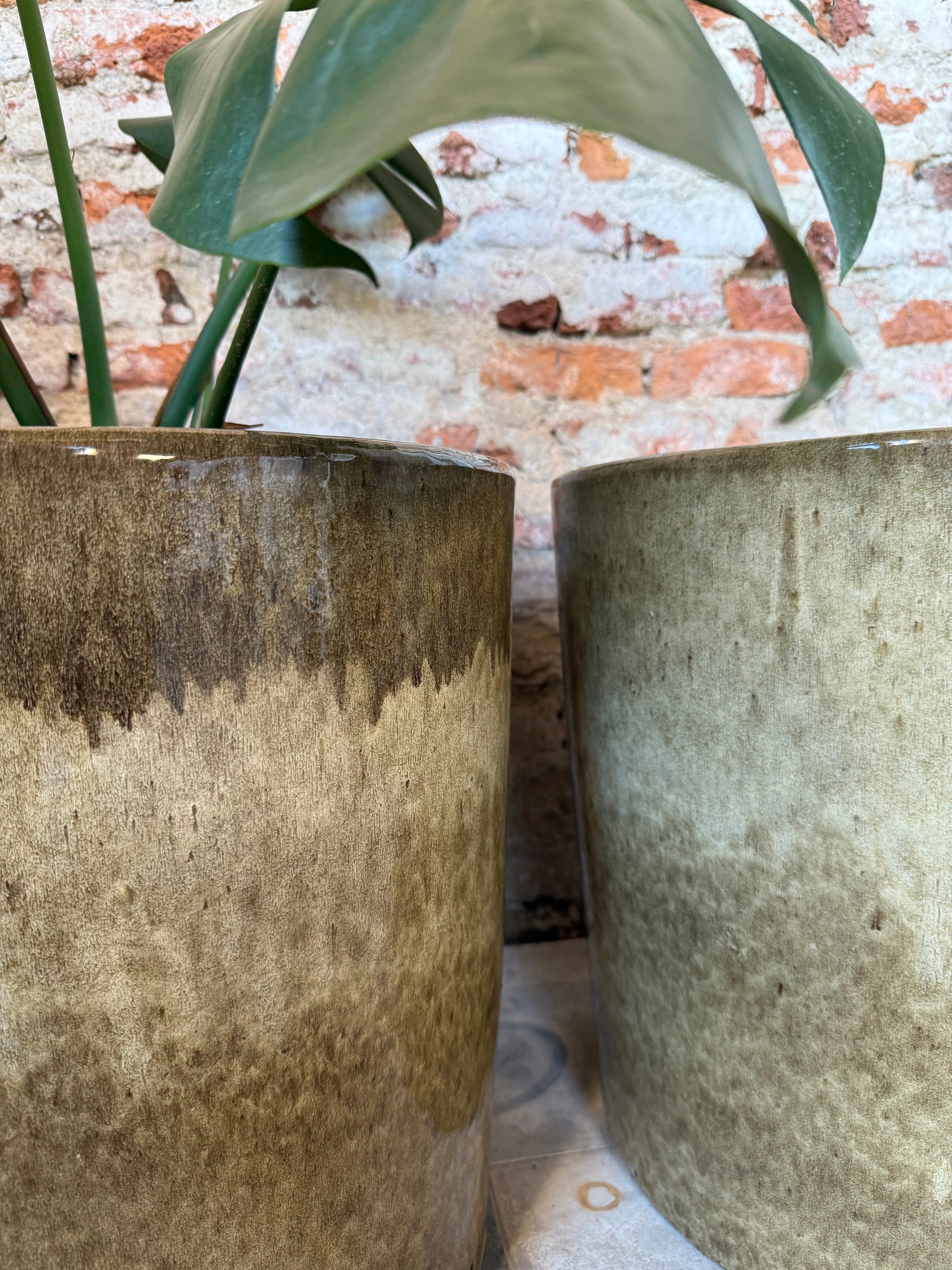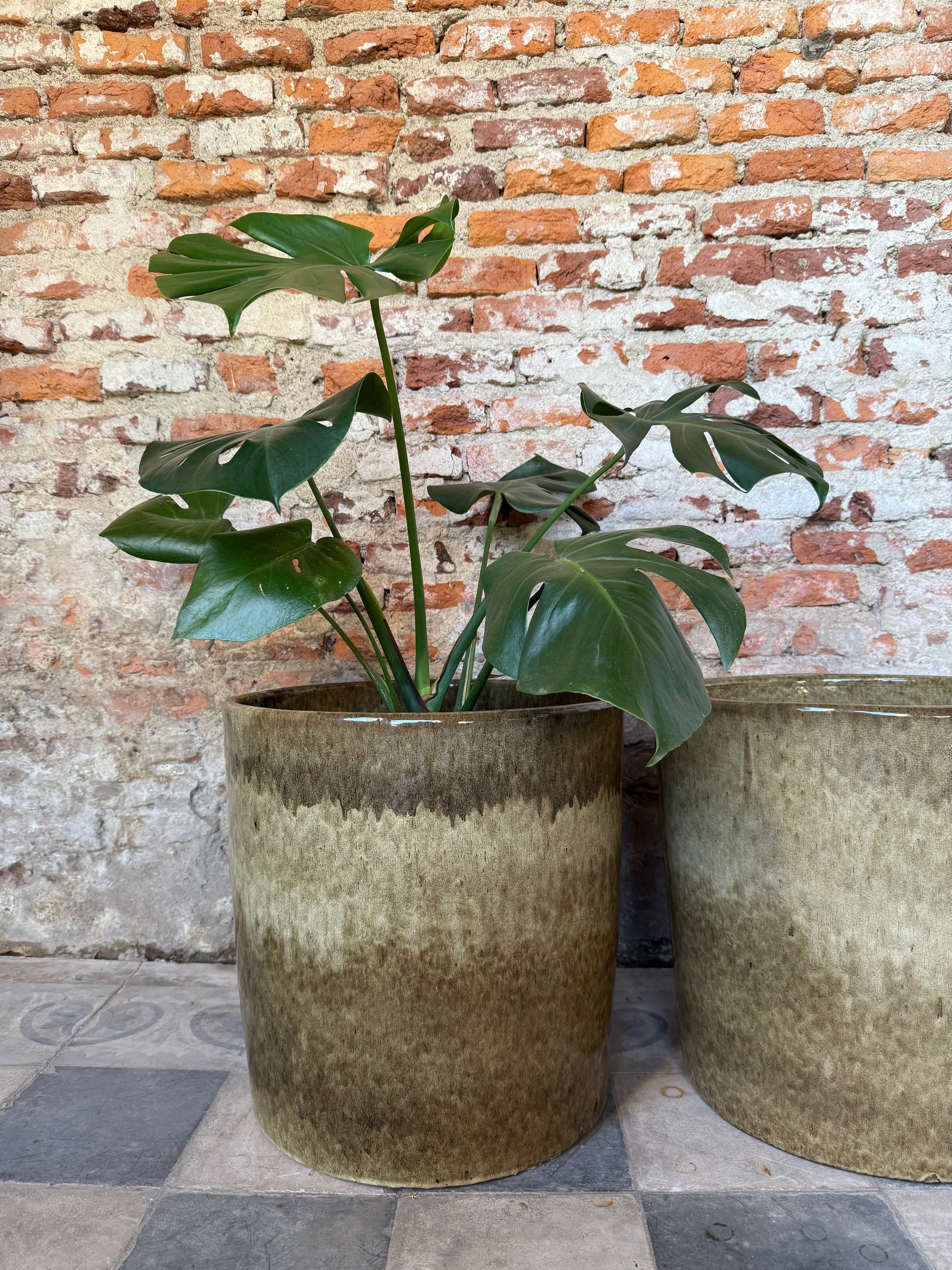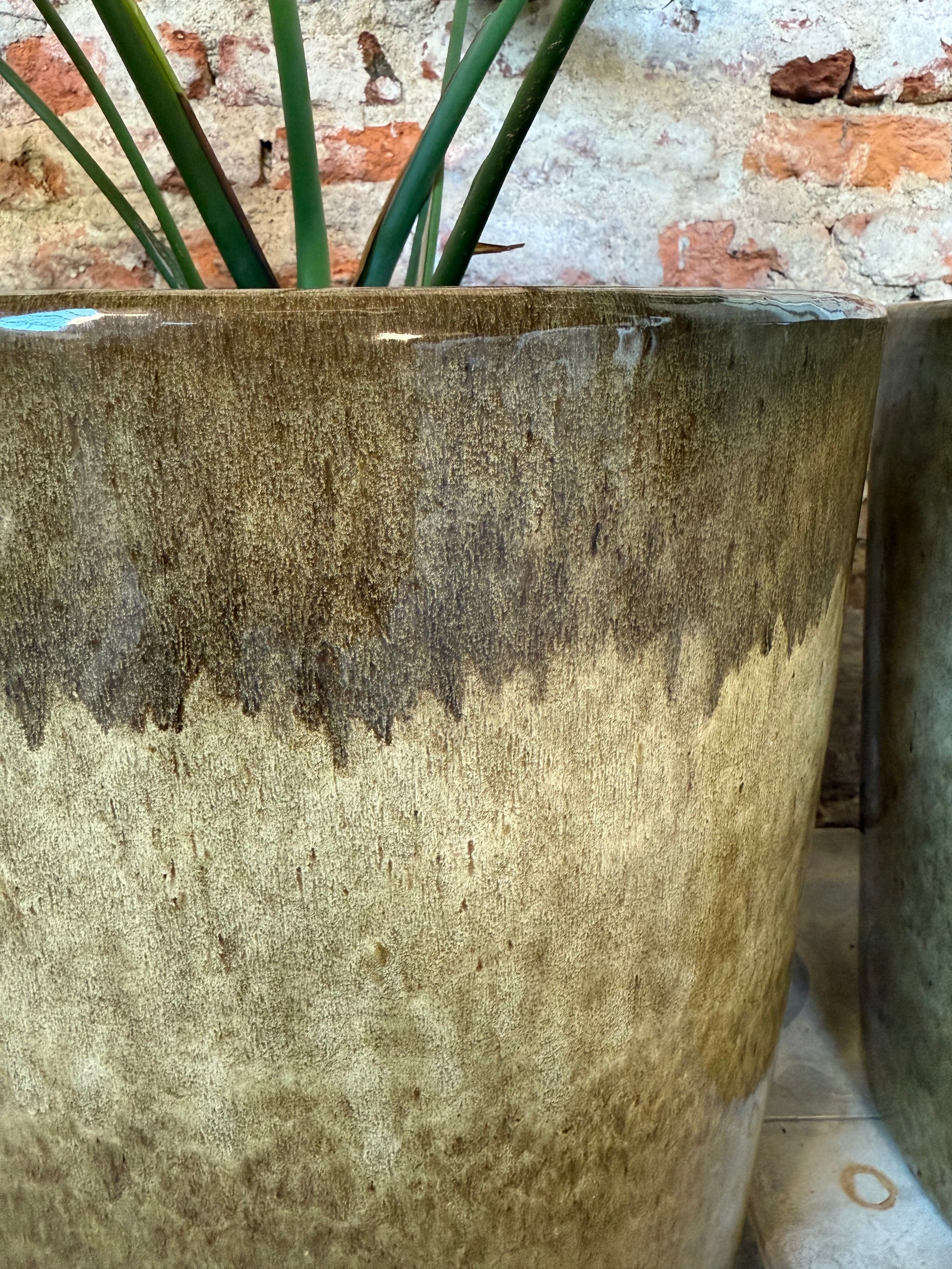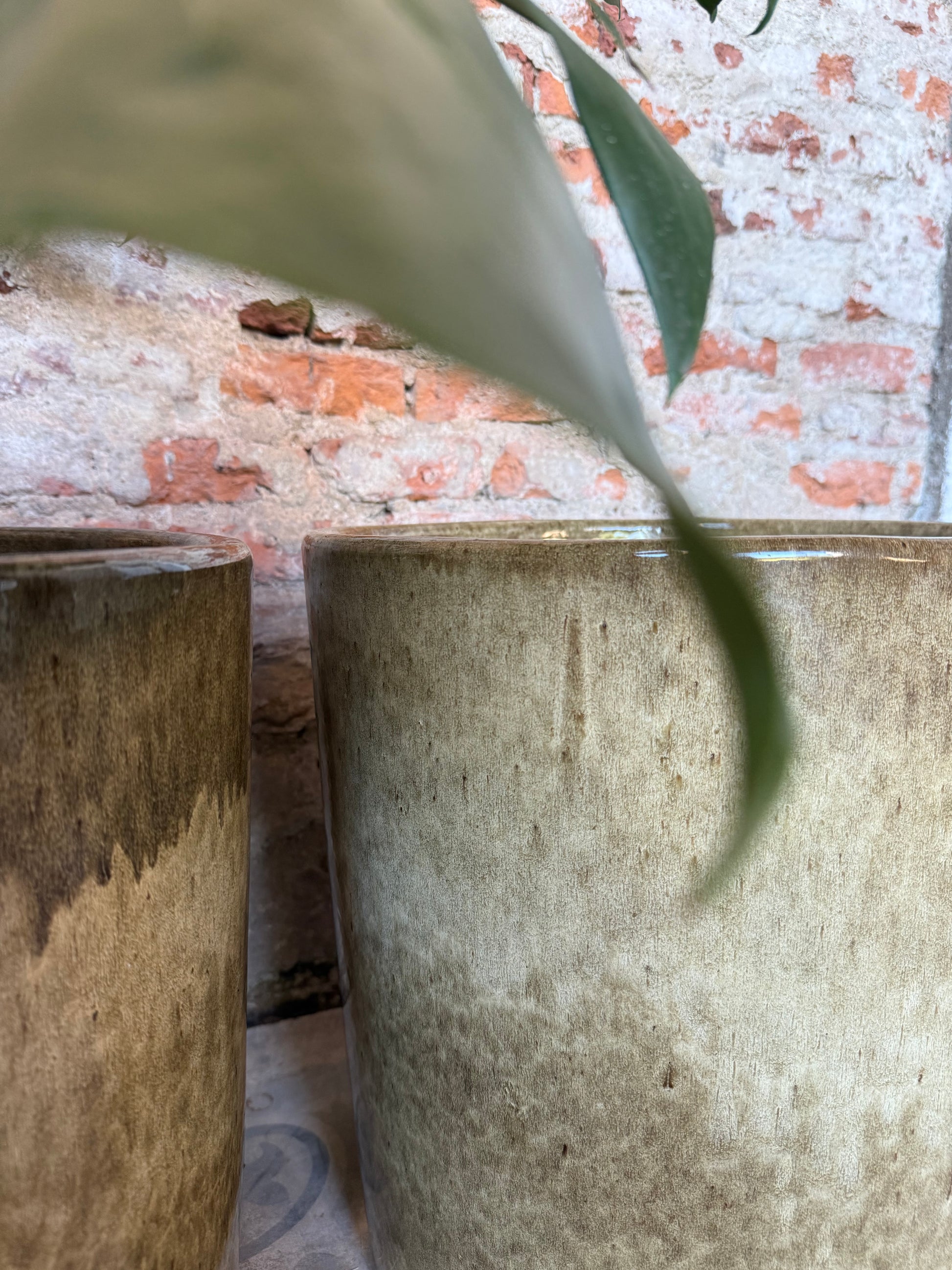 Una maceta de formas simples y esmaltado cálido, con un degradé que va del arena claro a un tostado profundo. ideal para sumar textura y calidez a cualquier espacio, tanto moderno como rústico.