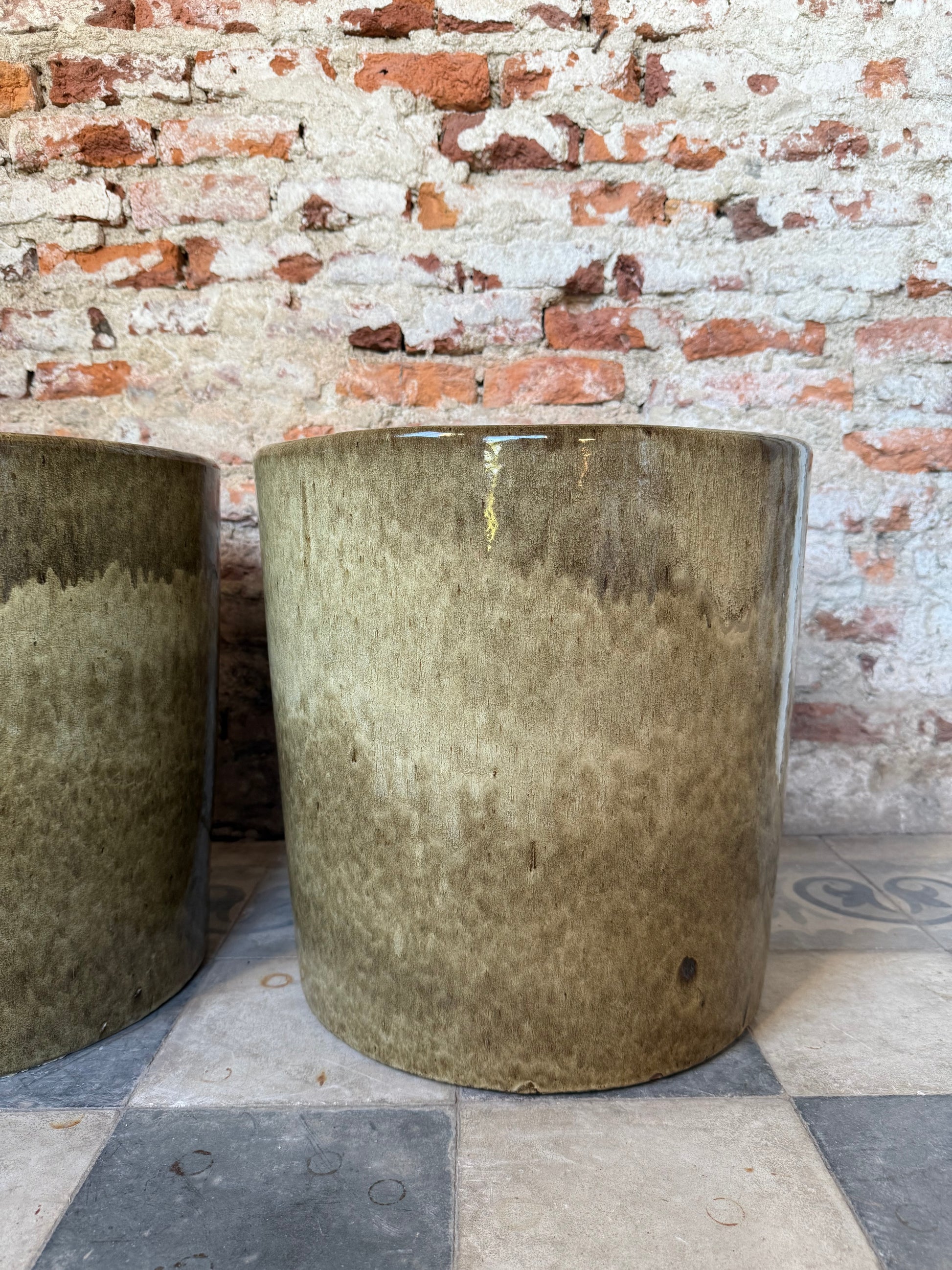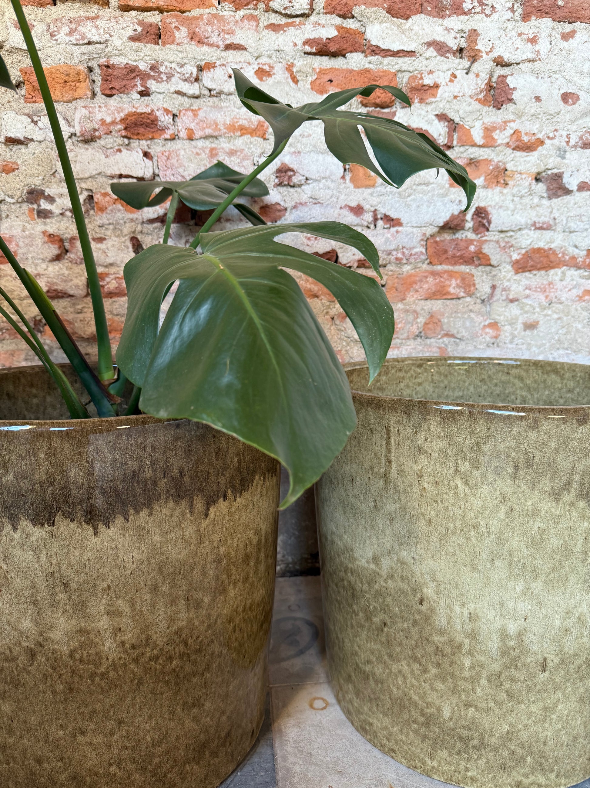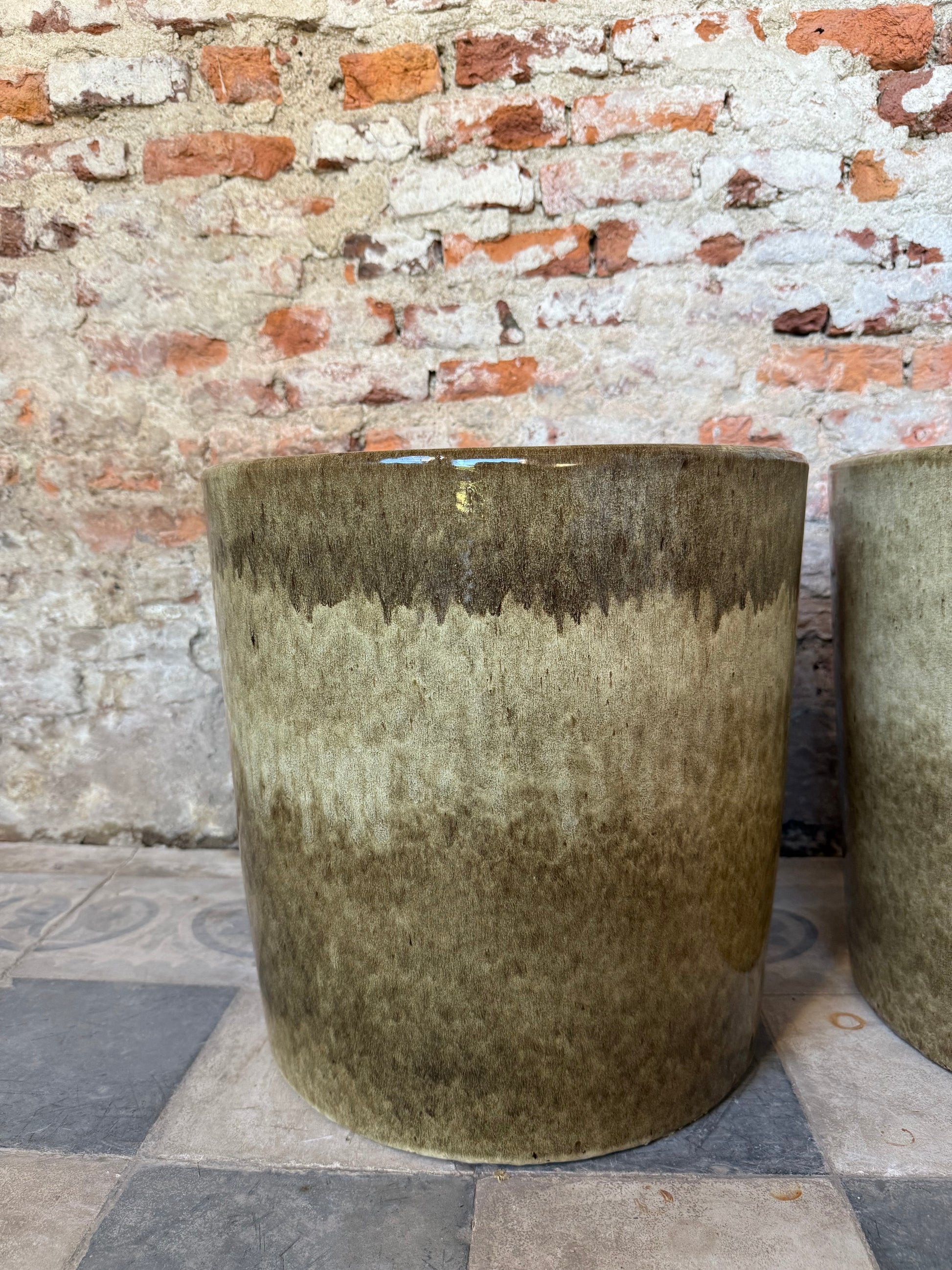Una maceta de formas simples y esmaltado cálido, con un degradé que va del arena claro a un tostado profundo. ideal para sumar textura y calidez a cualquier espacio, tanto moderno como rústico.