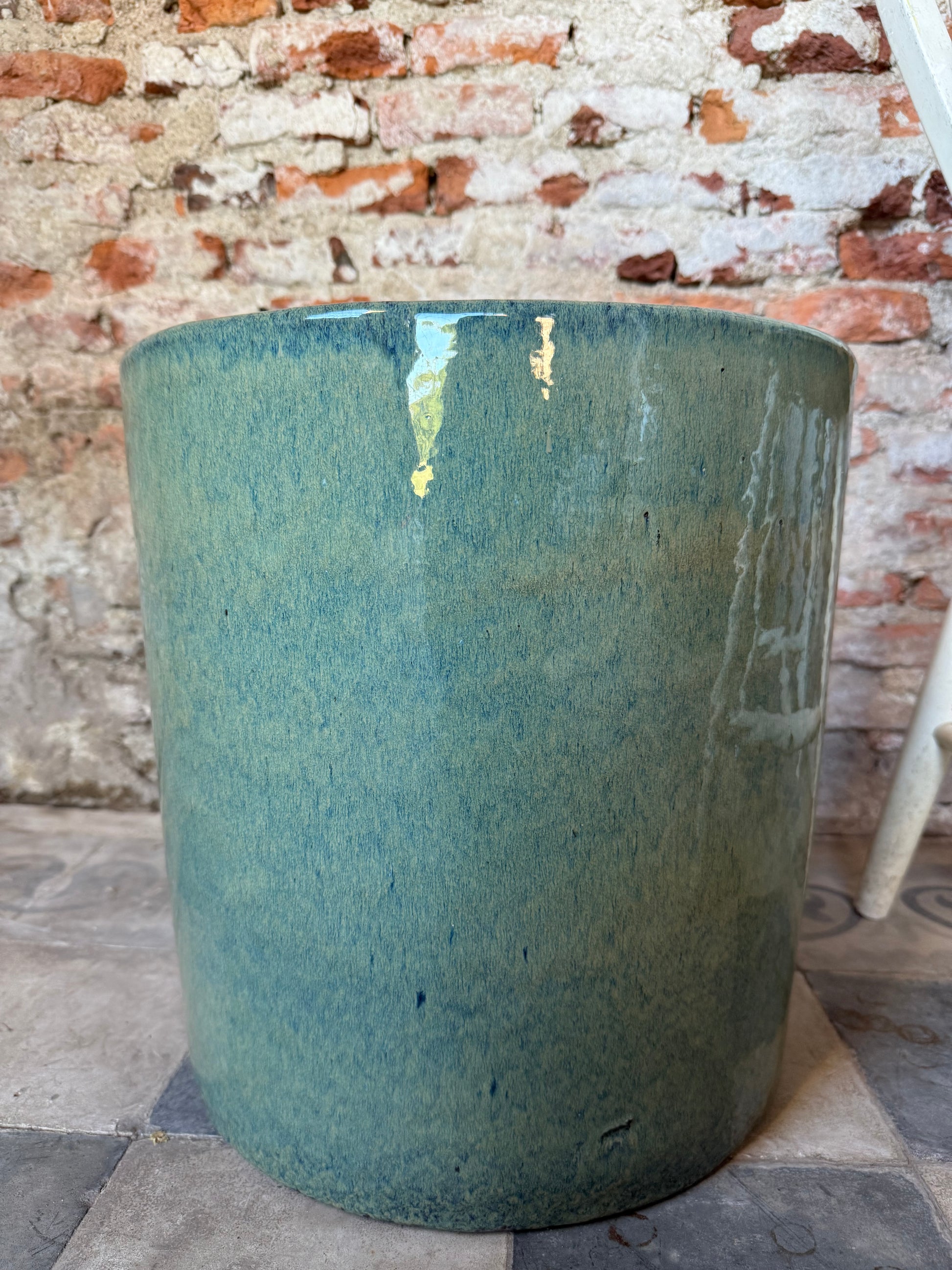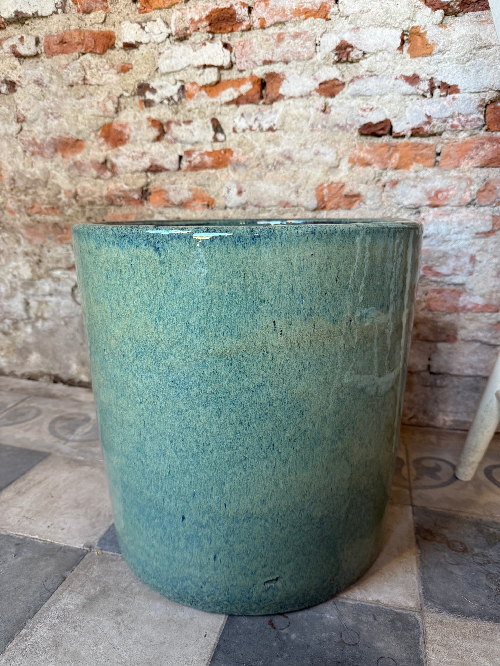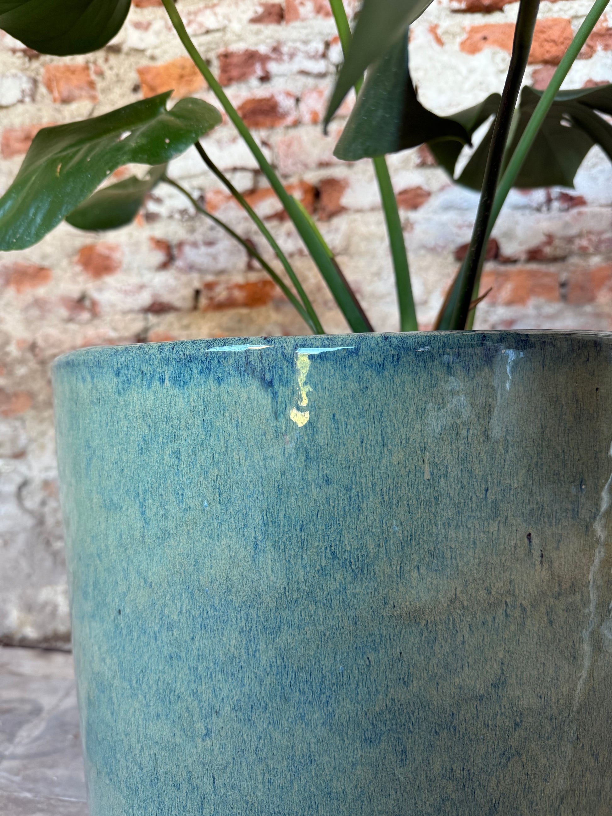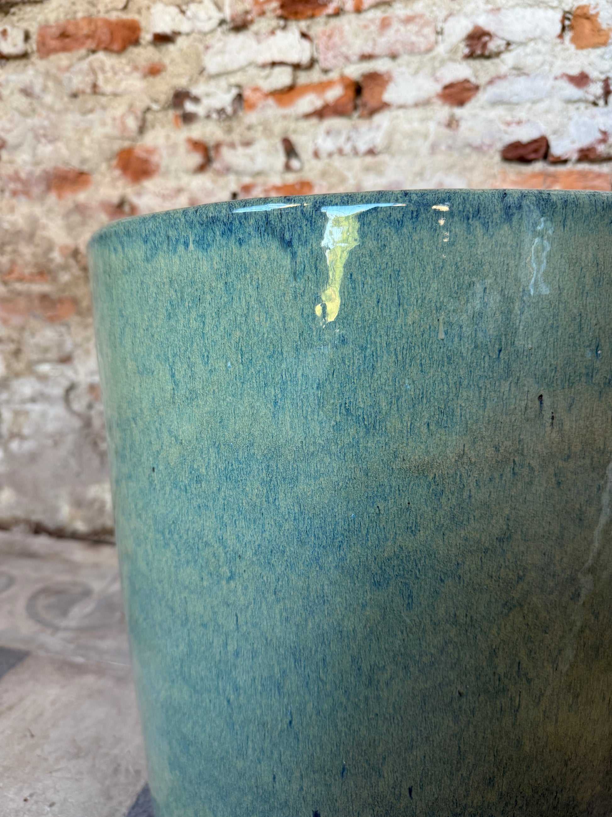 Maceta cilíndrica de gran porte y color único, que combina tonos verdes y azulados como el mar en calma. su acabado brillante y su forma minimalista la hacen ideal para plantas voluminosas o para destacar sola como objeto decorativo.