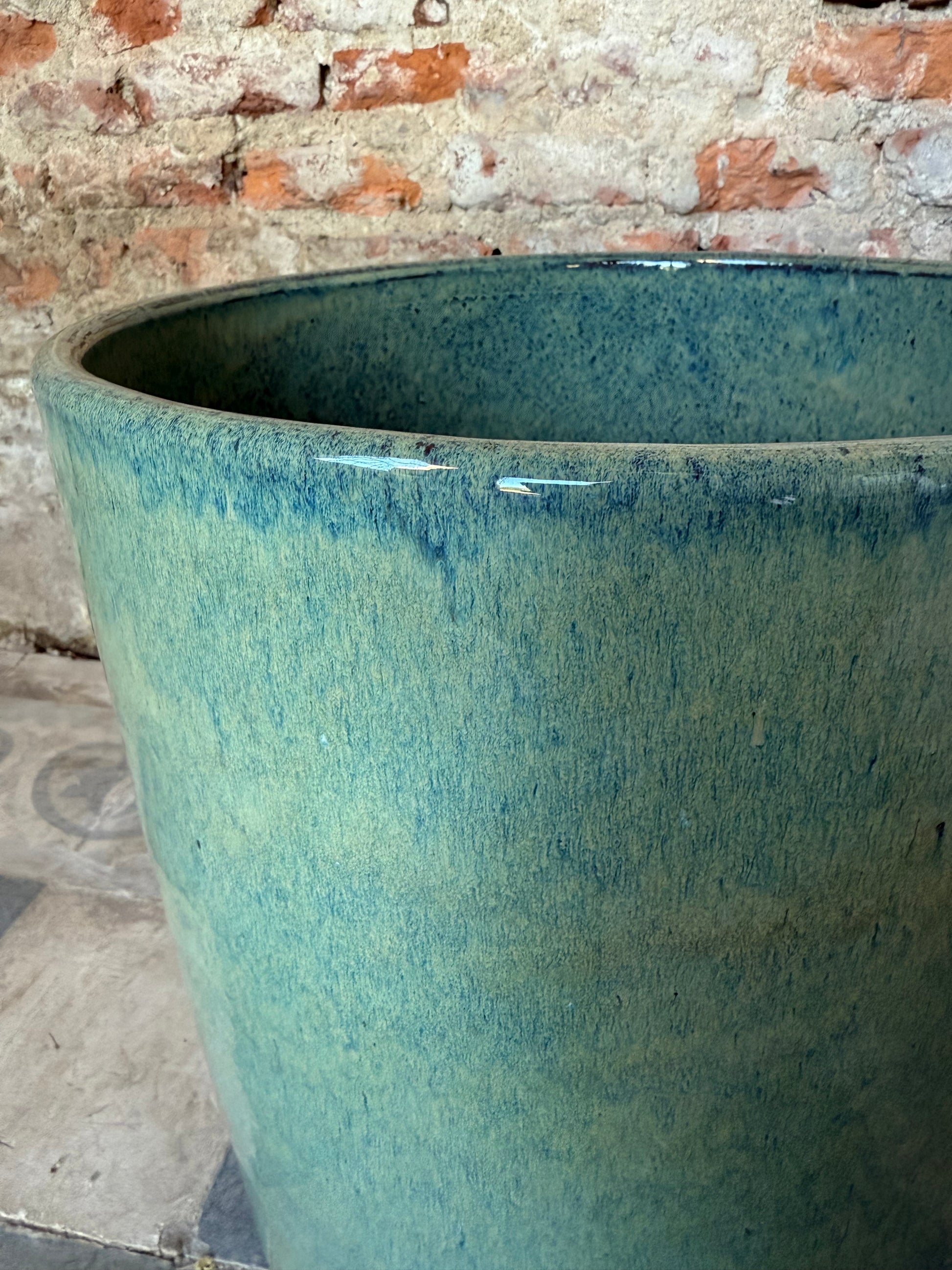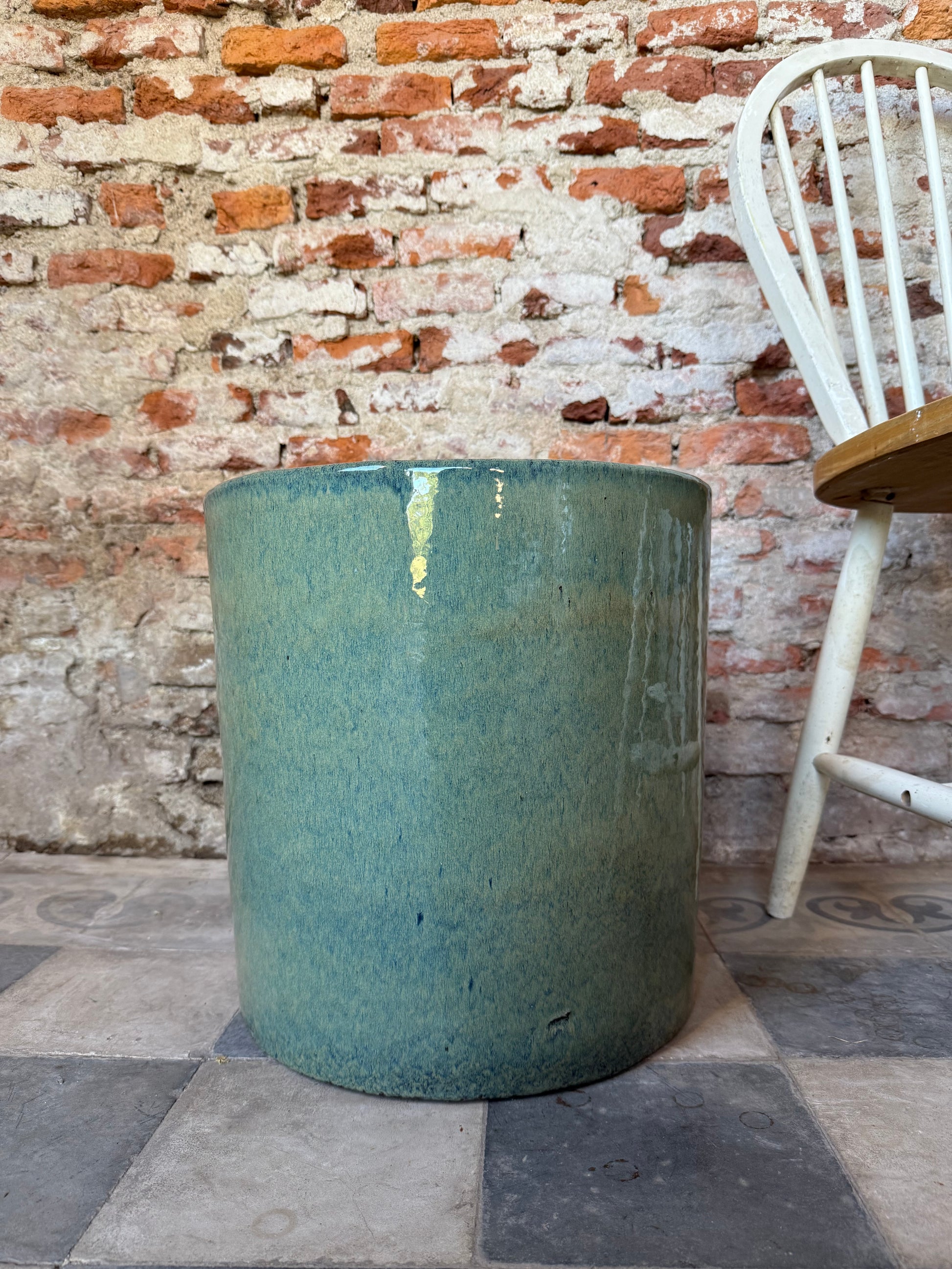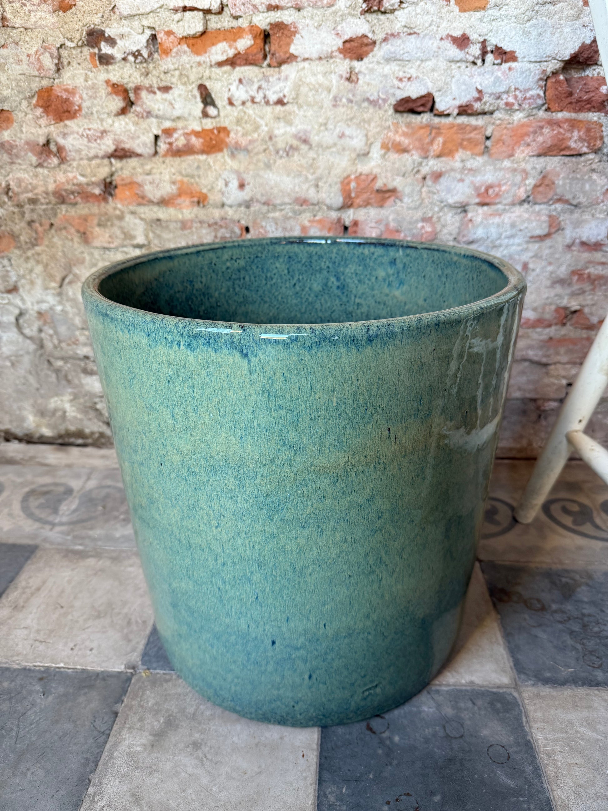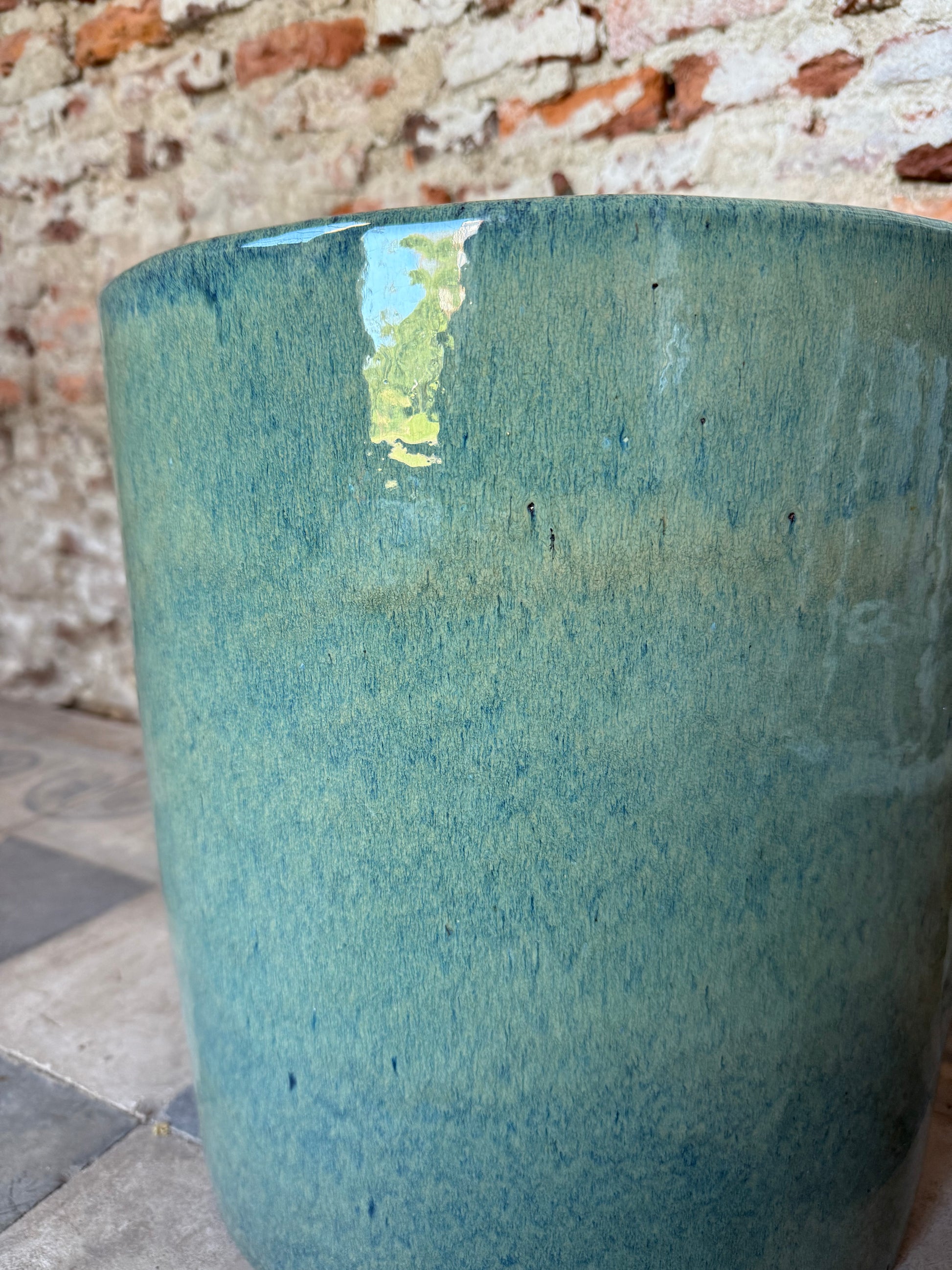 Maceta cilíndrica de gran porte y color único, que combina tonos verdes y azulados como el mar en calma. su acabado brillante y su forma minimalista la hacen ideal para plantas voluminosas o para destacar sola como objeto decorativo.