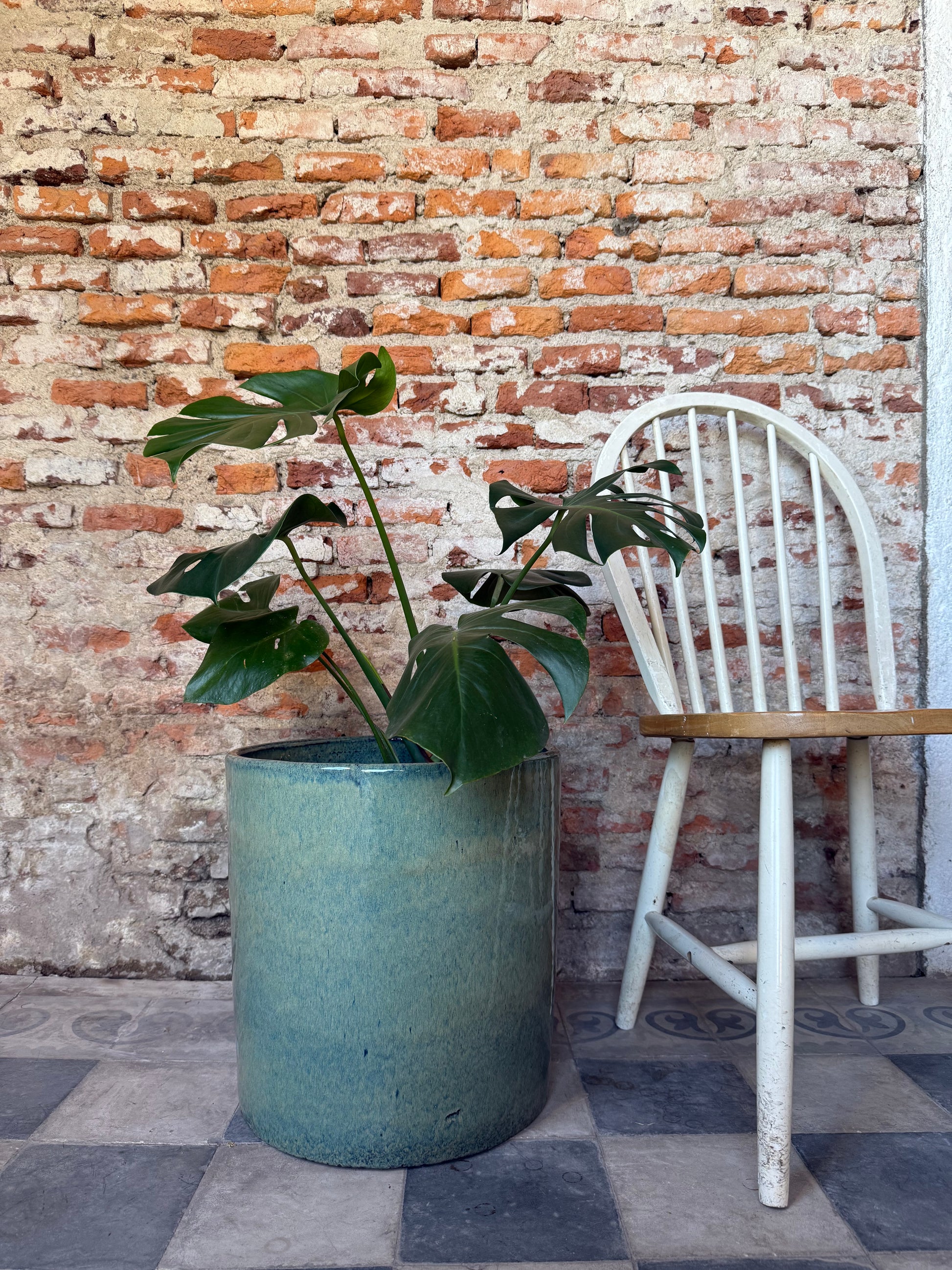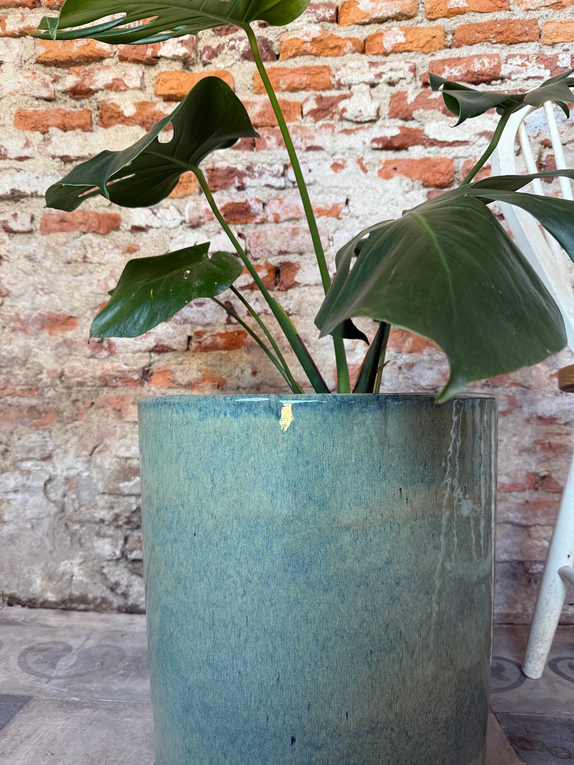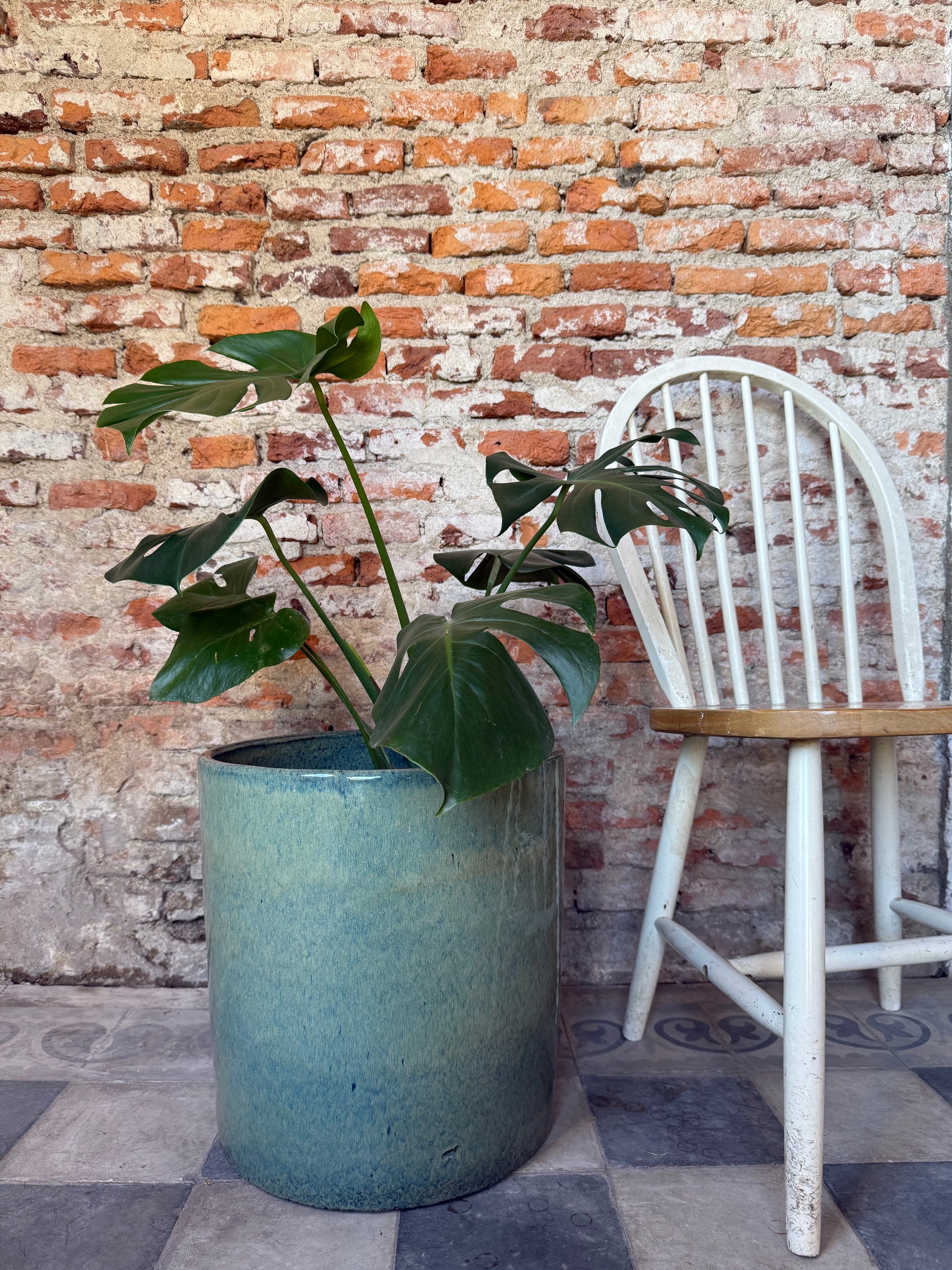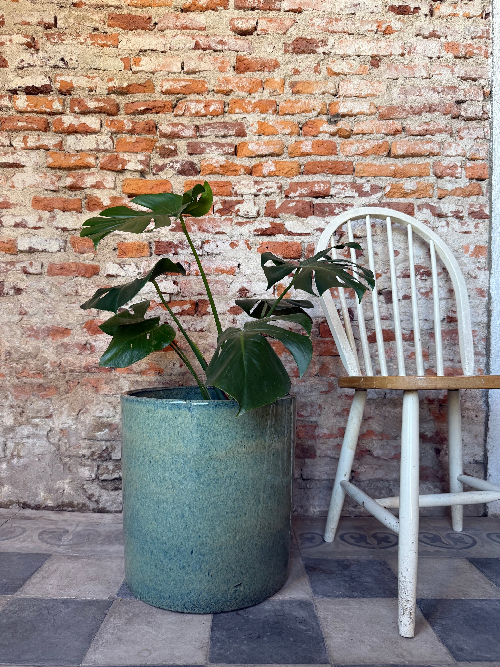 Maceta cilíndrica de gran porte y color único, que combina tonos verdes y azulados como el mar en calma. su acabado brillante y su forma minimalista la hacen ideal para plantas voluminosas o para destacar sola como objeto decorativo.