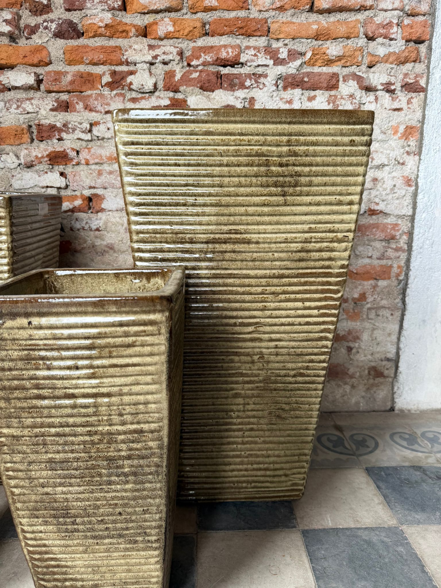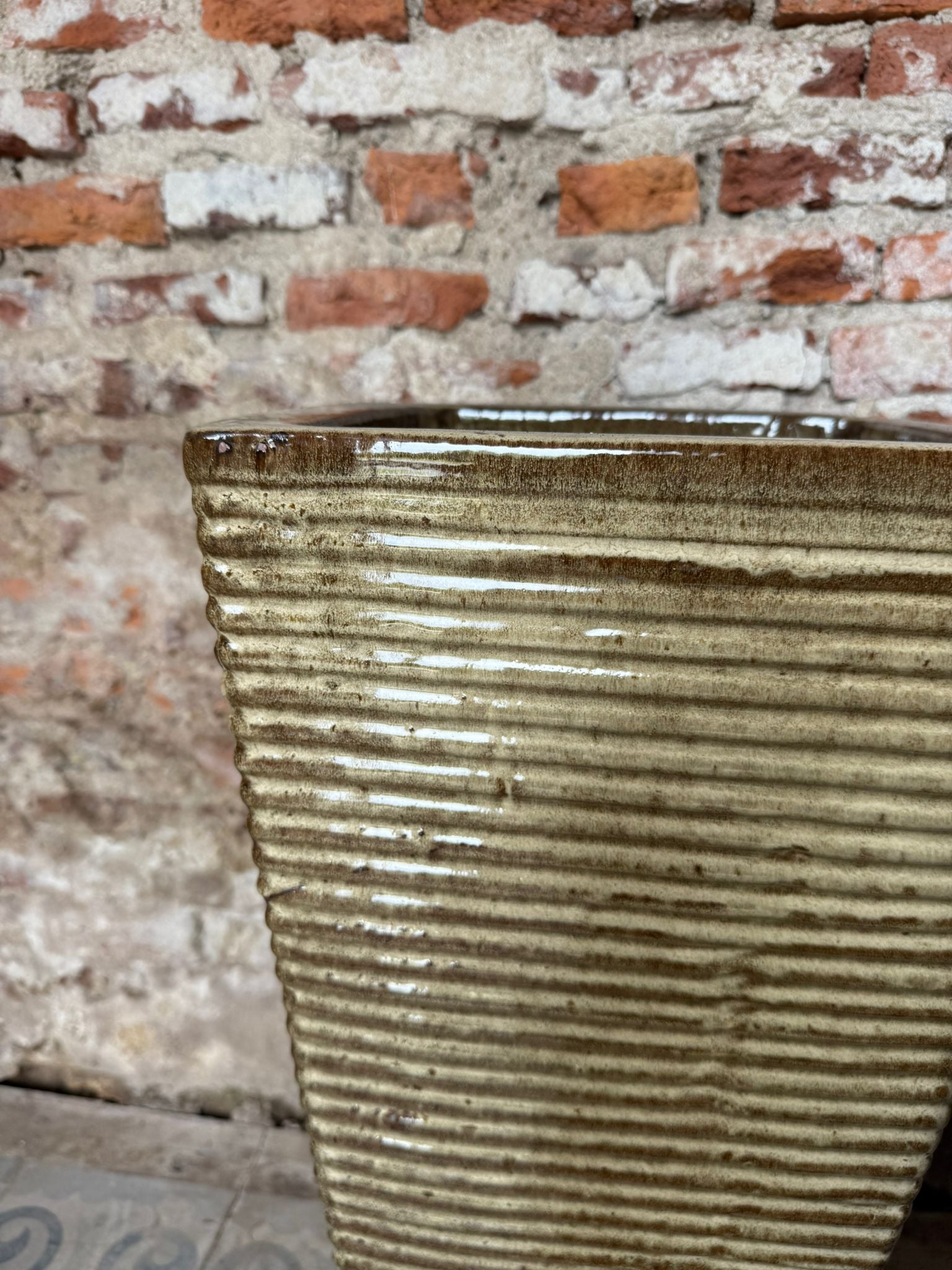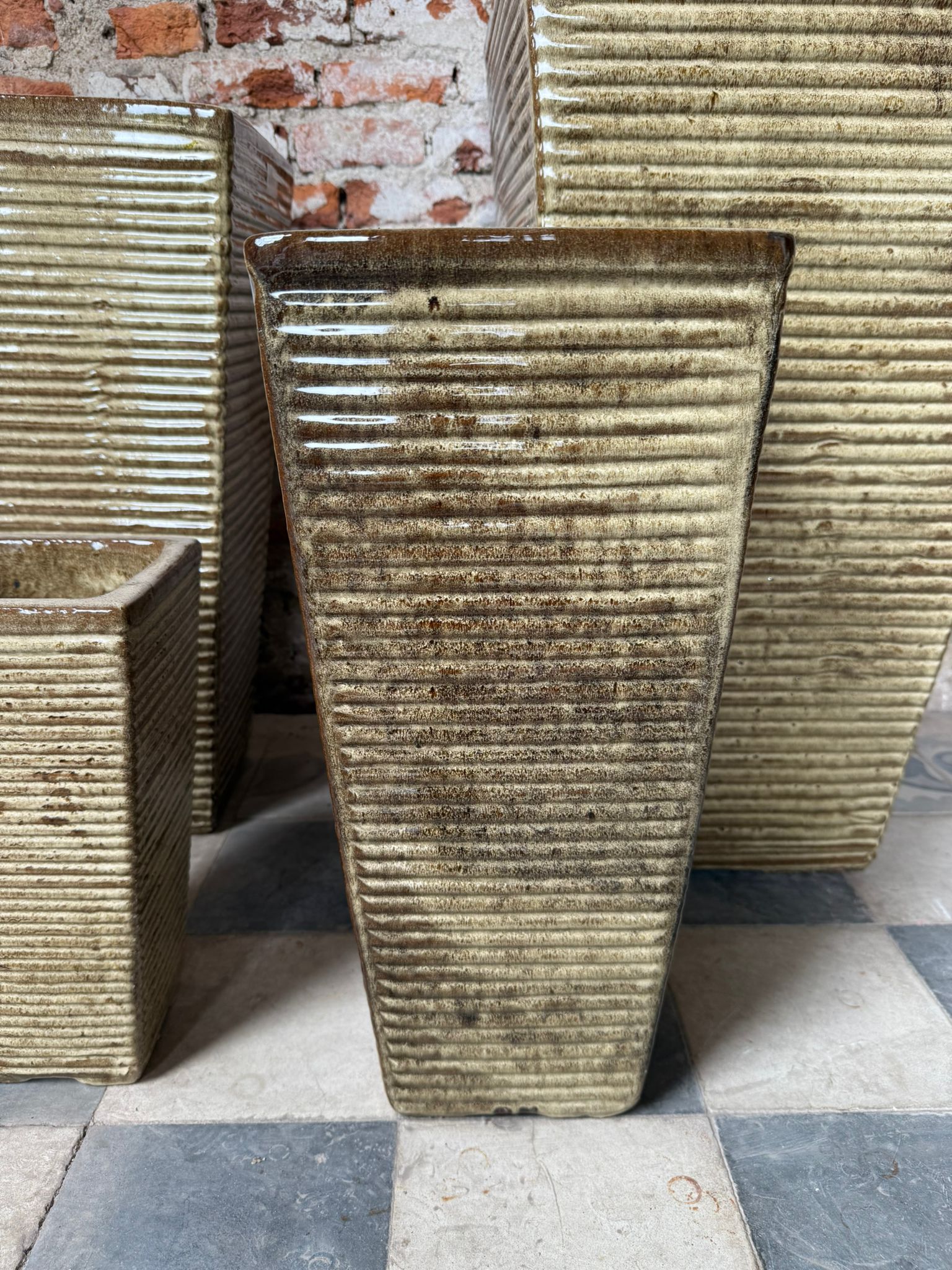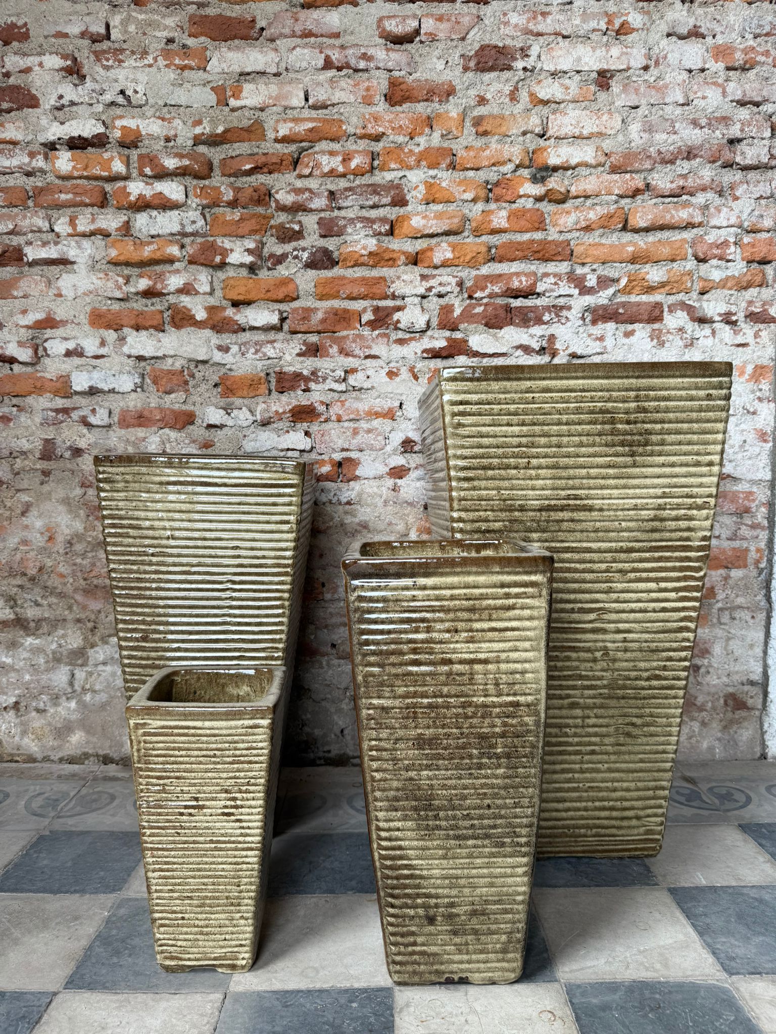 Este modelo alto y de forma cuadrada se destaca por sus líneas acanaladas, su movimiento visual y su toque moderno. Ideal para lucir plantas grandes en interiores o exteriores.