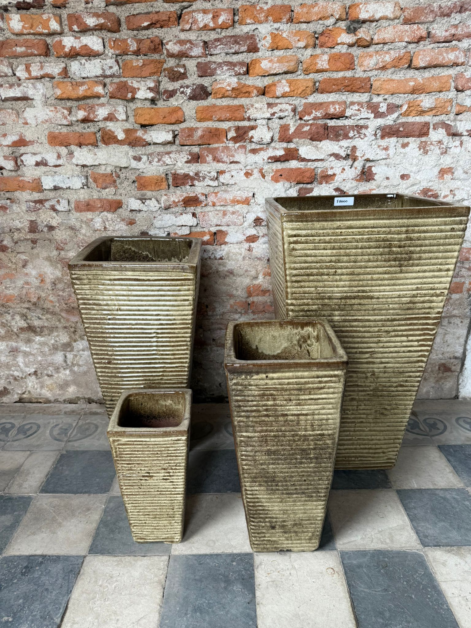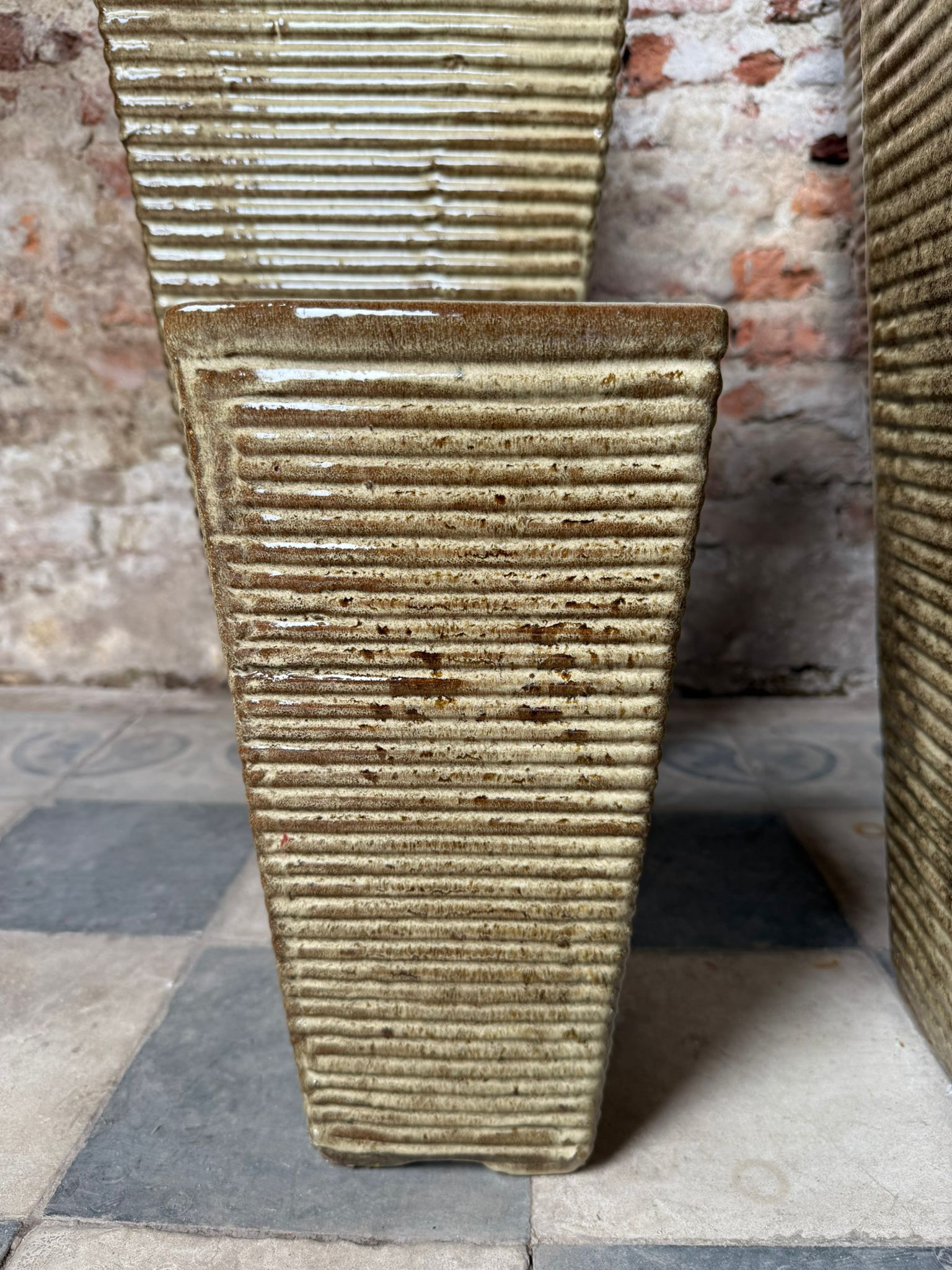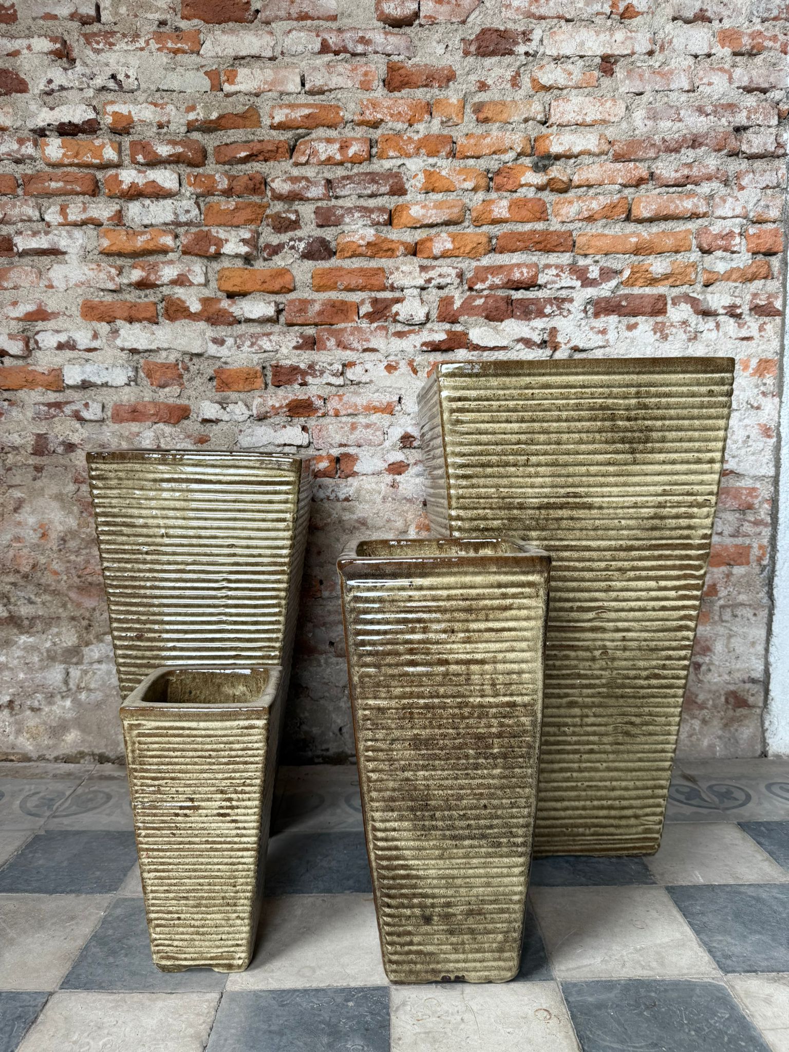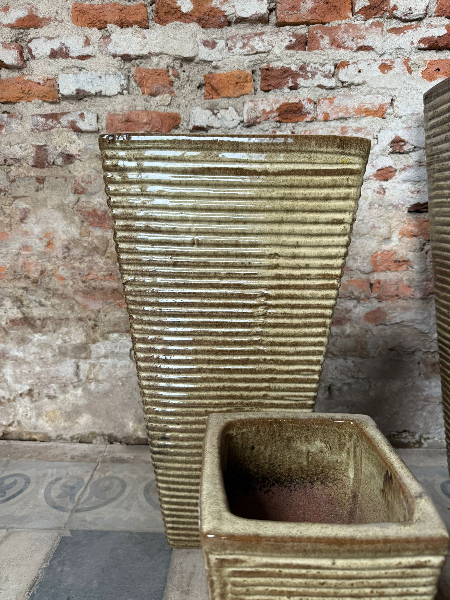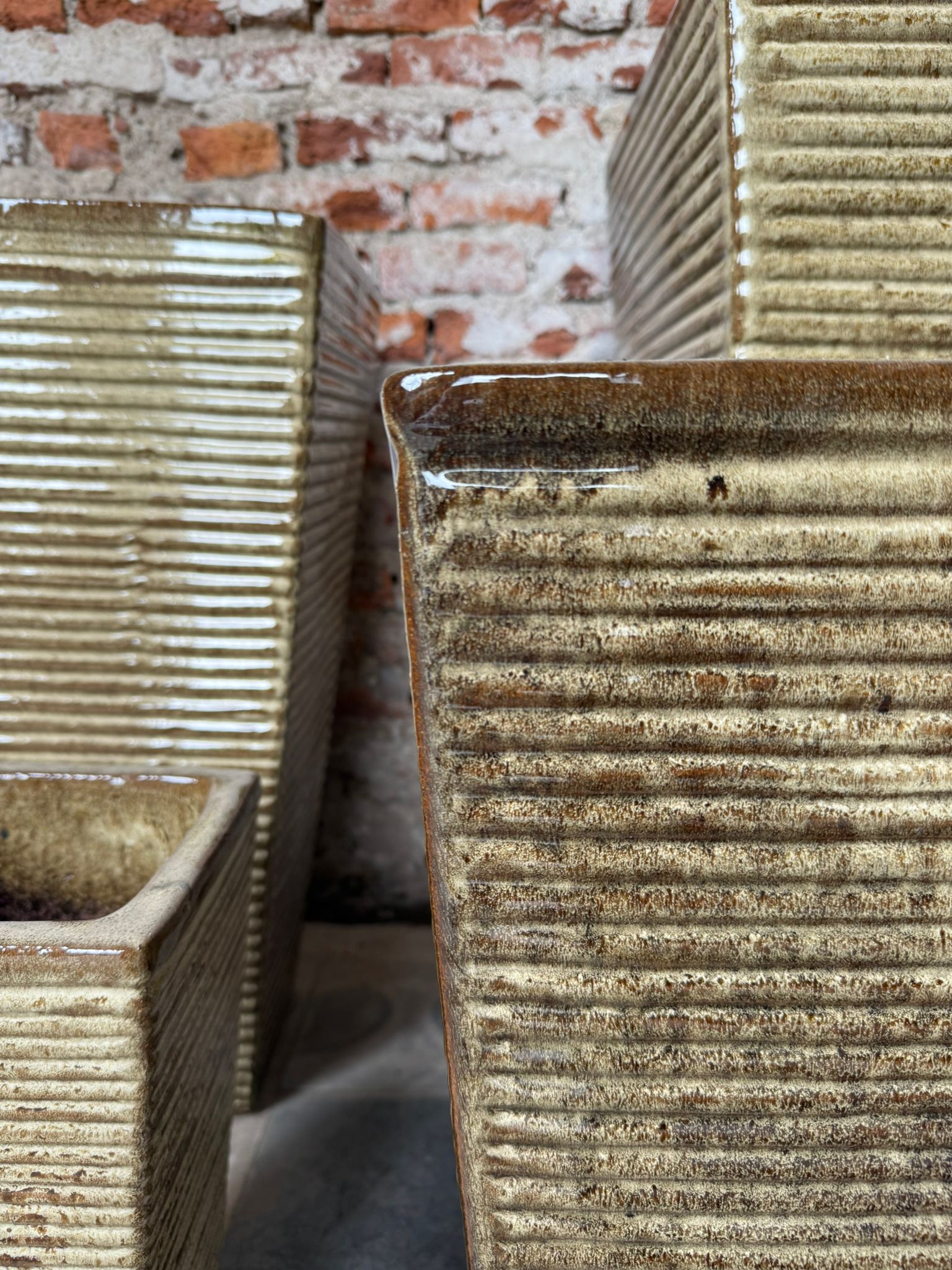 Este modelo alto y de forma cuadrada se destaca por sus líneas acanaladas, su movimiento visual y su toque moderno. Ideal para lucir plantas grandes en interiores o exteriores.