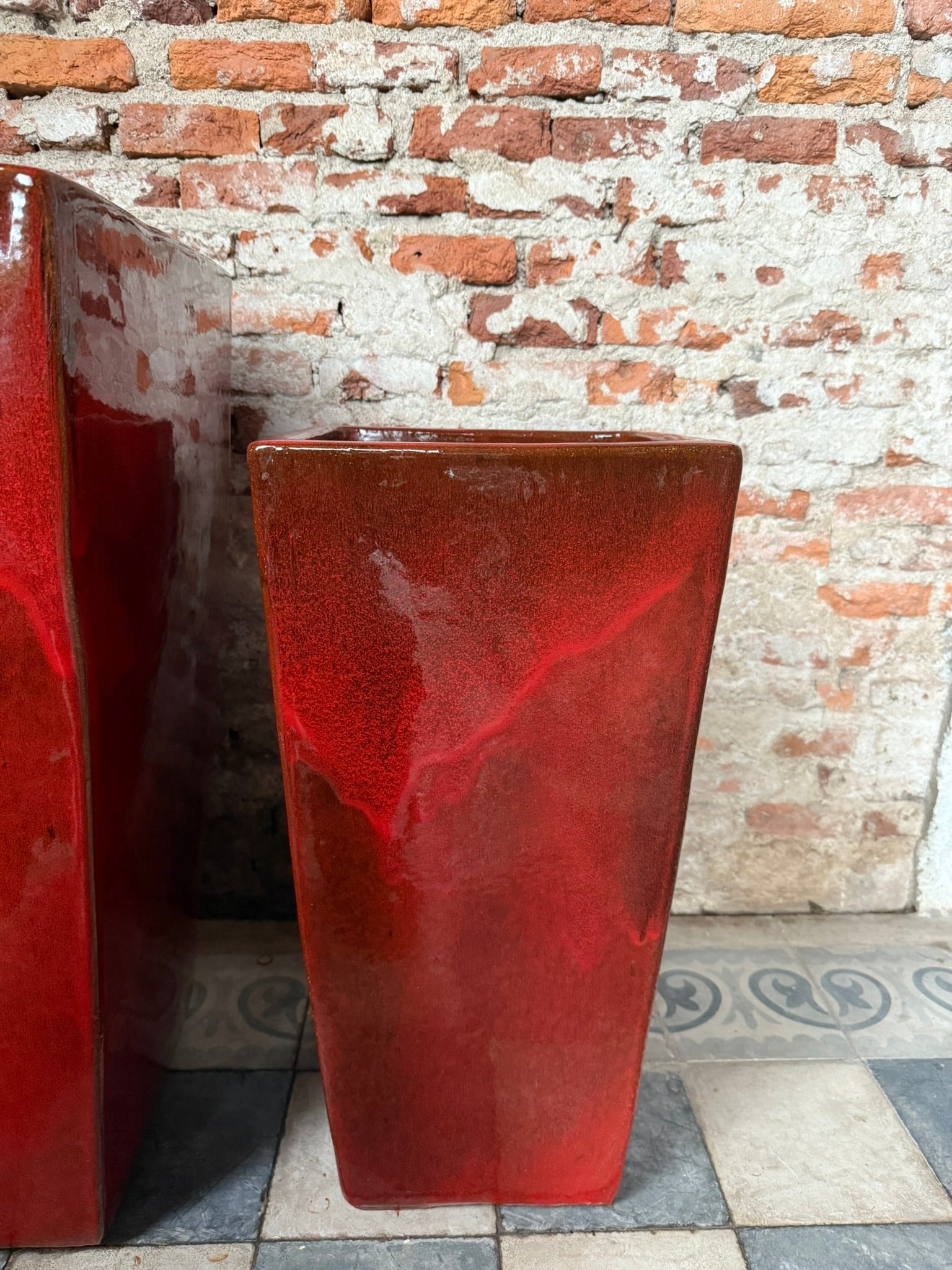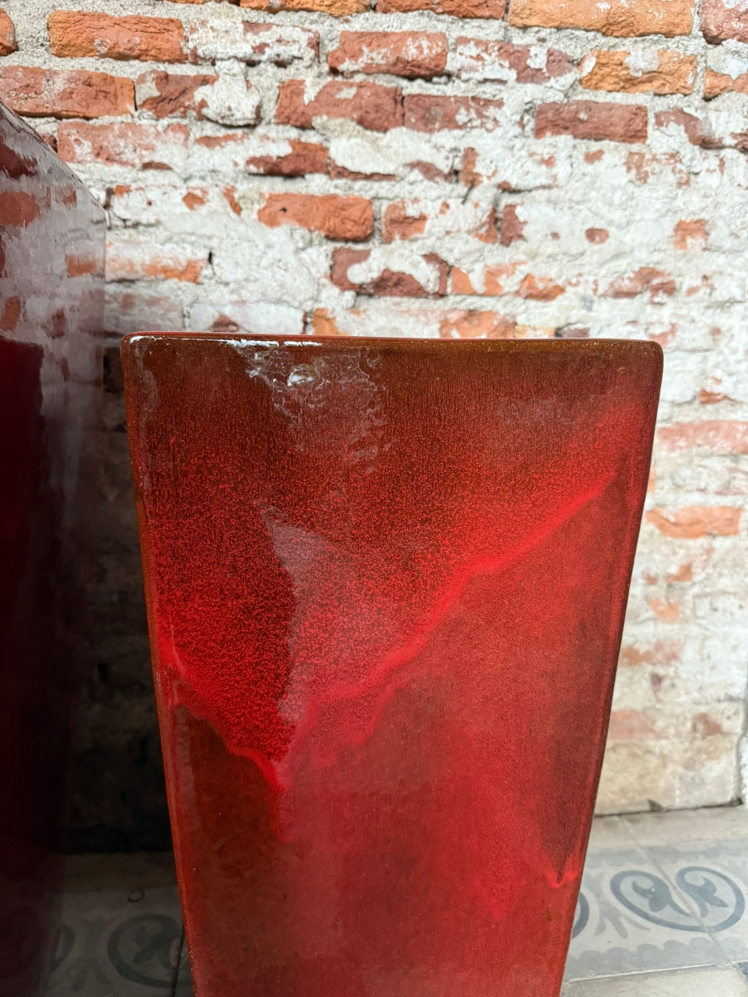 El esmalte en rojo profundo con vetas oscuras varía en cada pieza, haciendo que ninguna sea igual a otra.