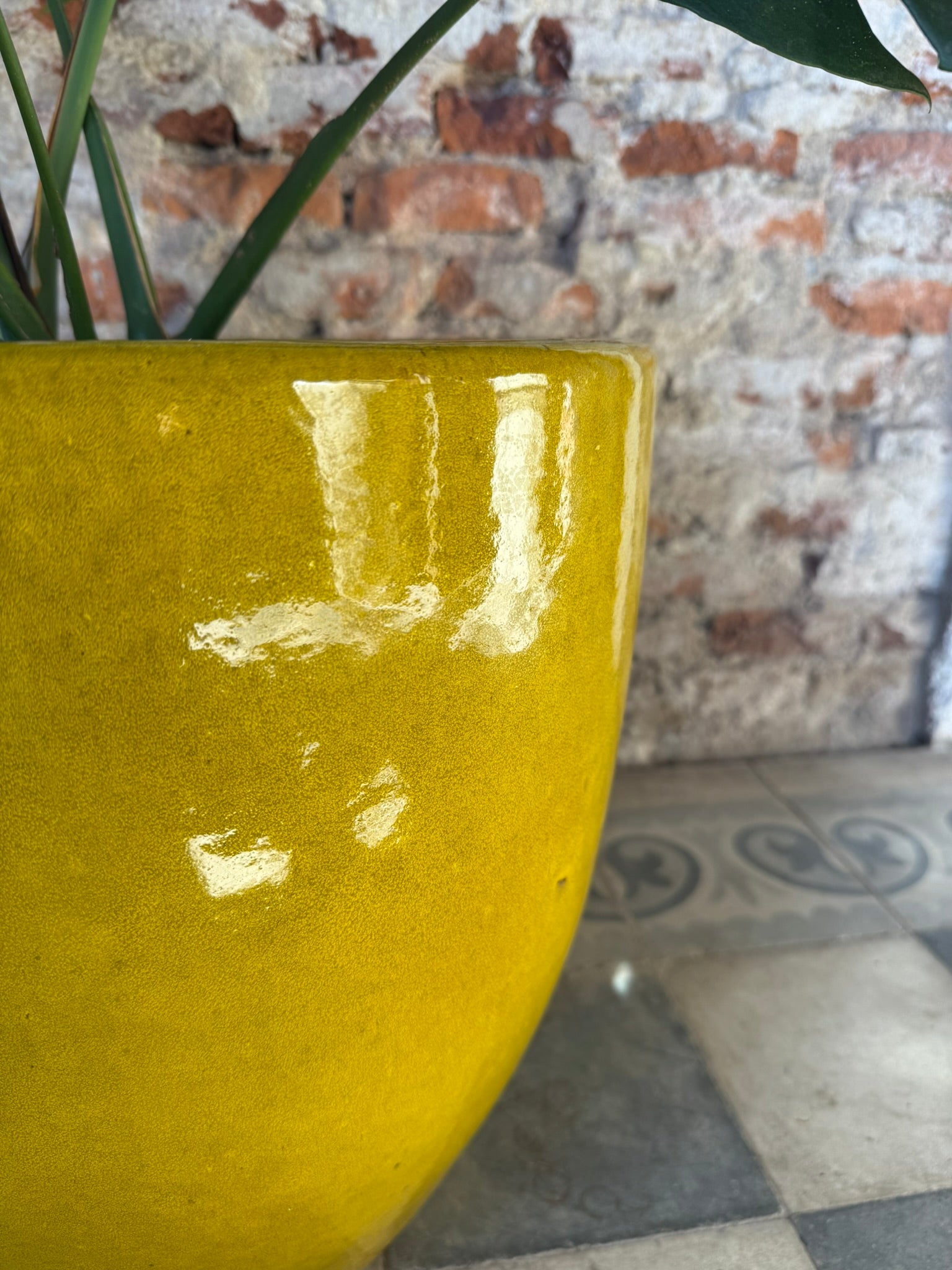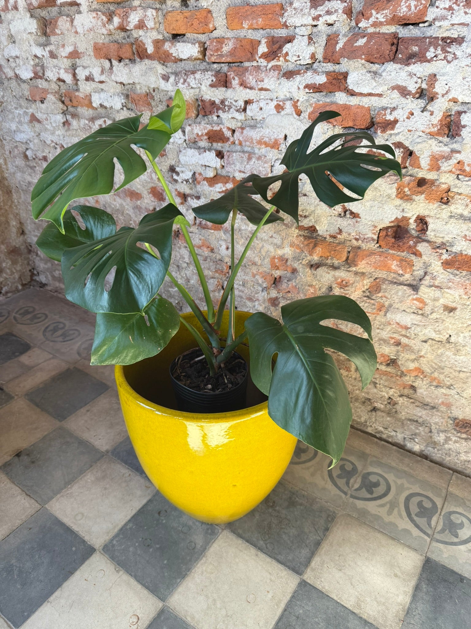 Con un esmalte amarillo intenso que refleja la luz como el sol de la tarde, esta maceta es ideal para dar protagonismo a cualquier rincón. Su altura y presencia la hacen perfecta para plantas de follaje generoso como la Monstera, pero también acompaña muy bien composiciones más minimalistas.