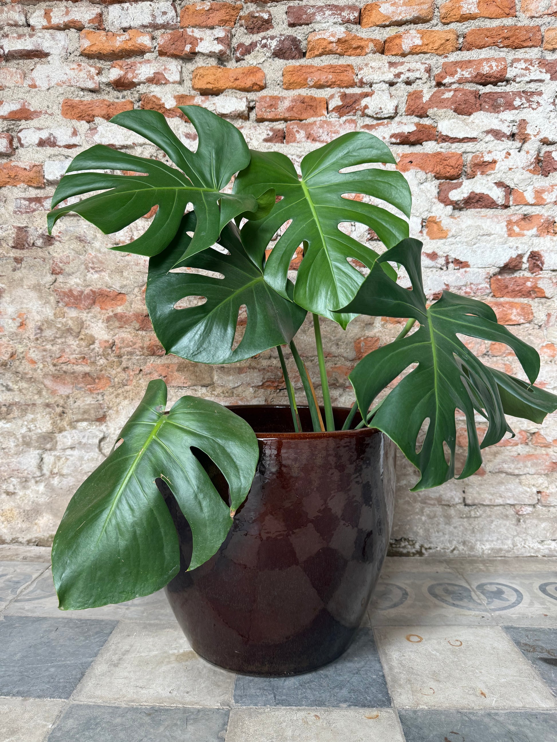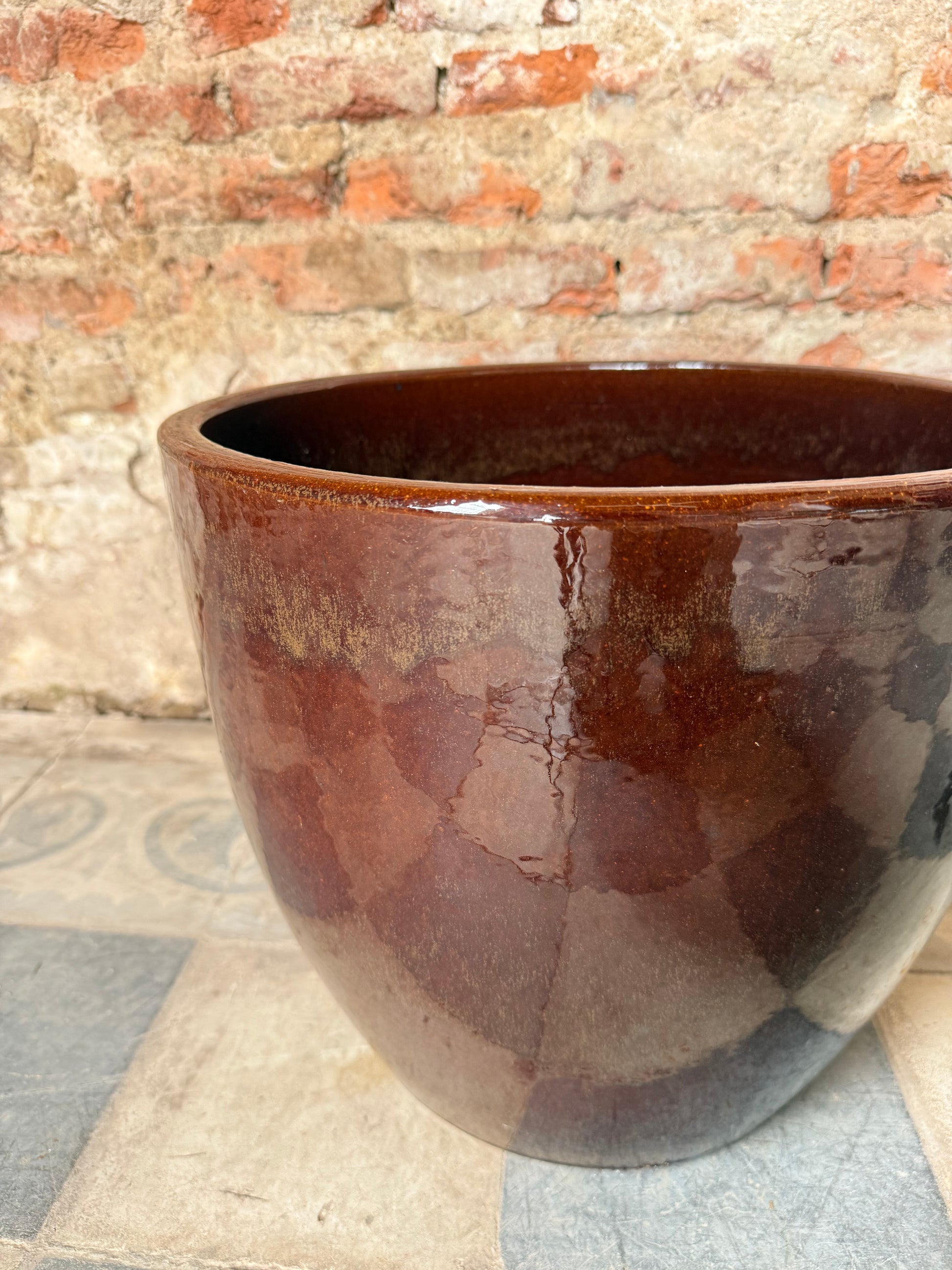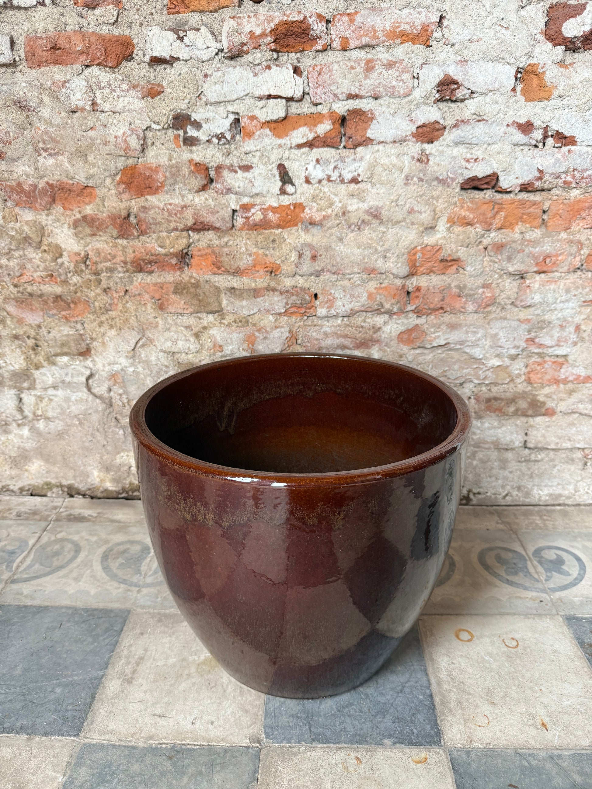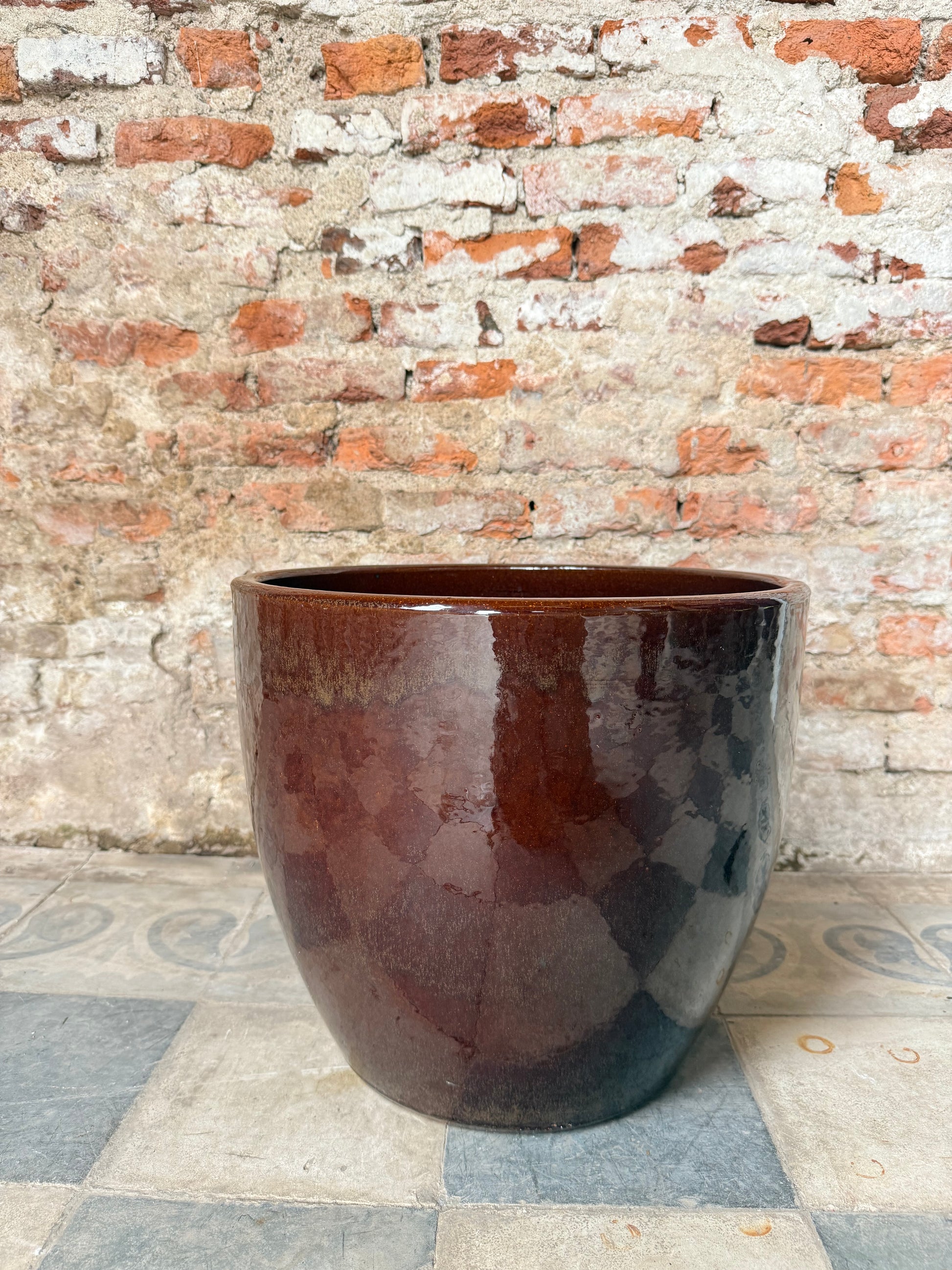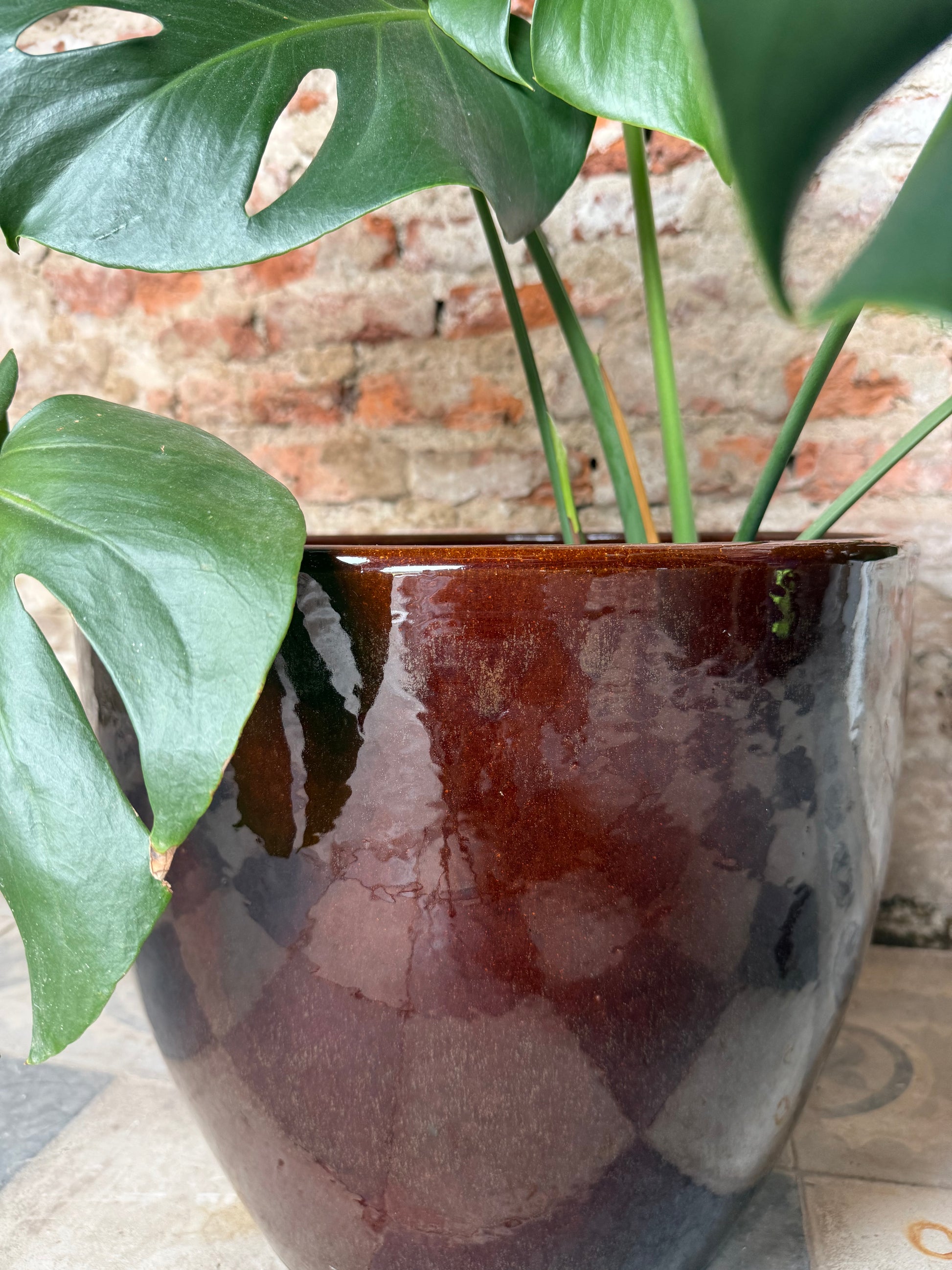 De forma amplia y proporcionada, este modelo es ideal para resaltar plantas de follaje tropical o de porte medio, creando un contraste refinado entre el verde intenso y el brillo único de su esmaltado. Cada pieza es trabajada de manera artesanal, lo que garantiza que no haya dos iguales: los tonos y reflejos varían en cada maceta, dándole un carácter exclusivo.