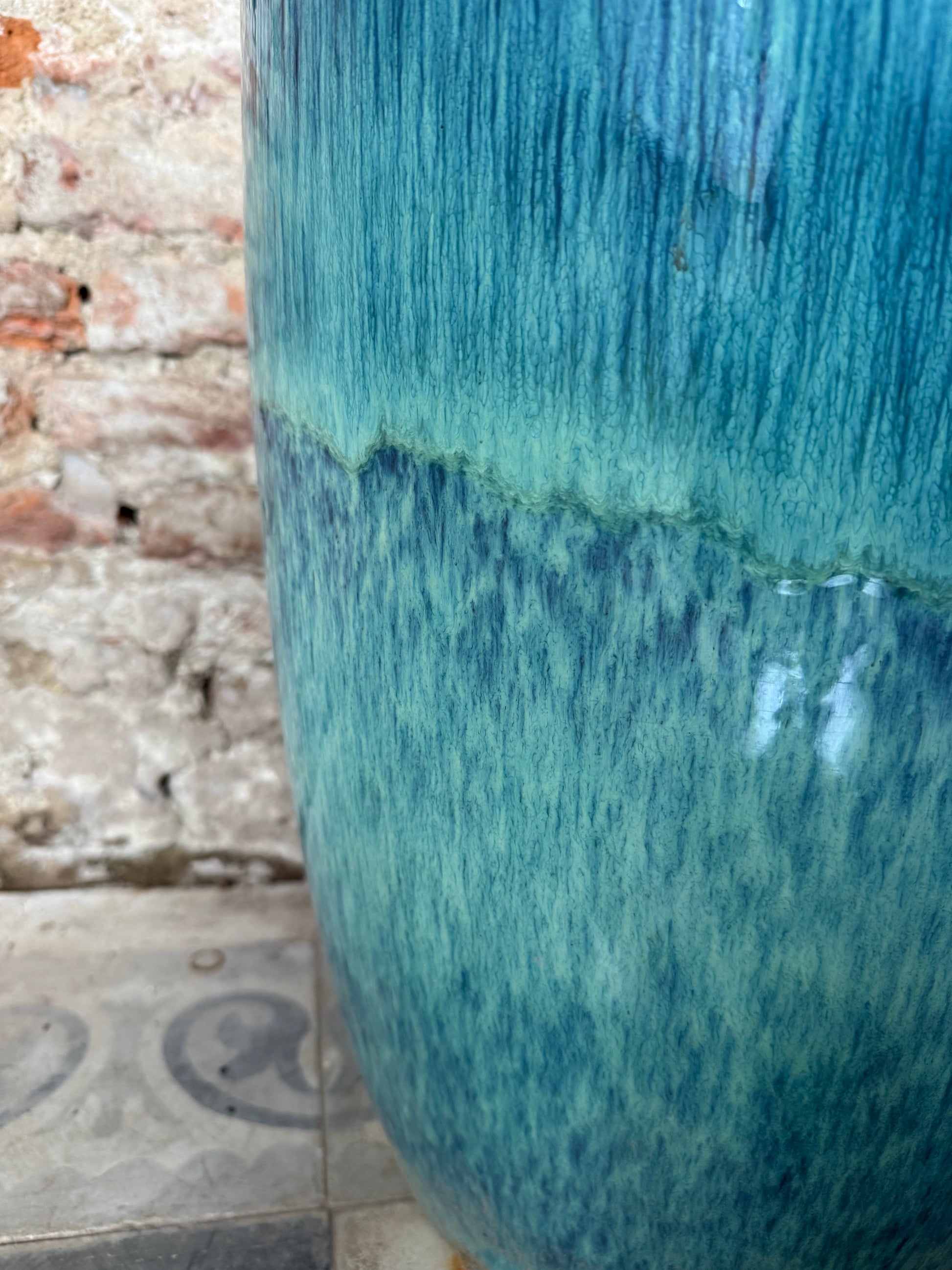 Regalía Aqua es frescura y armonía en estado puro. Con su acabado esmaltado en tonos azules y turquesa, evoca la calma del mar y la serenidad de los lagos cristalinos. Su degradado natural de color transmite movimiento y profundidad, creando un efecto visual único que realza cualquier ambiente.