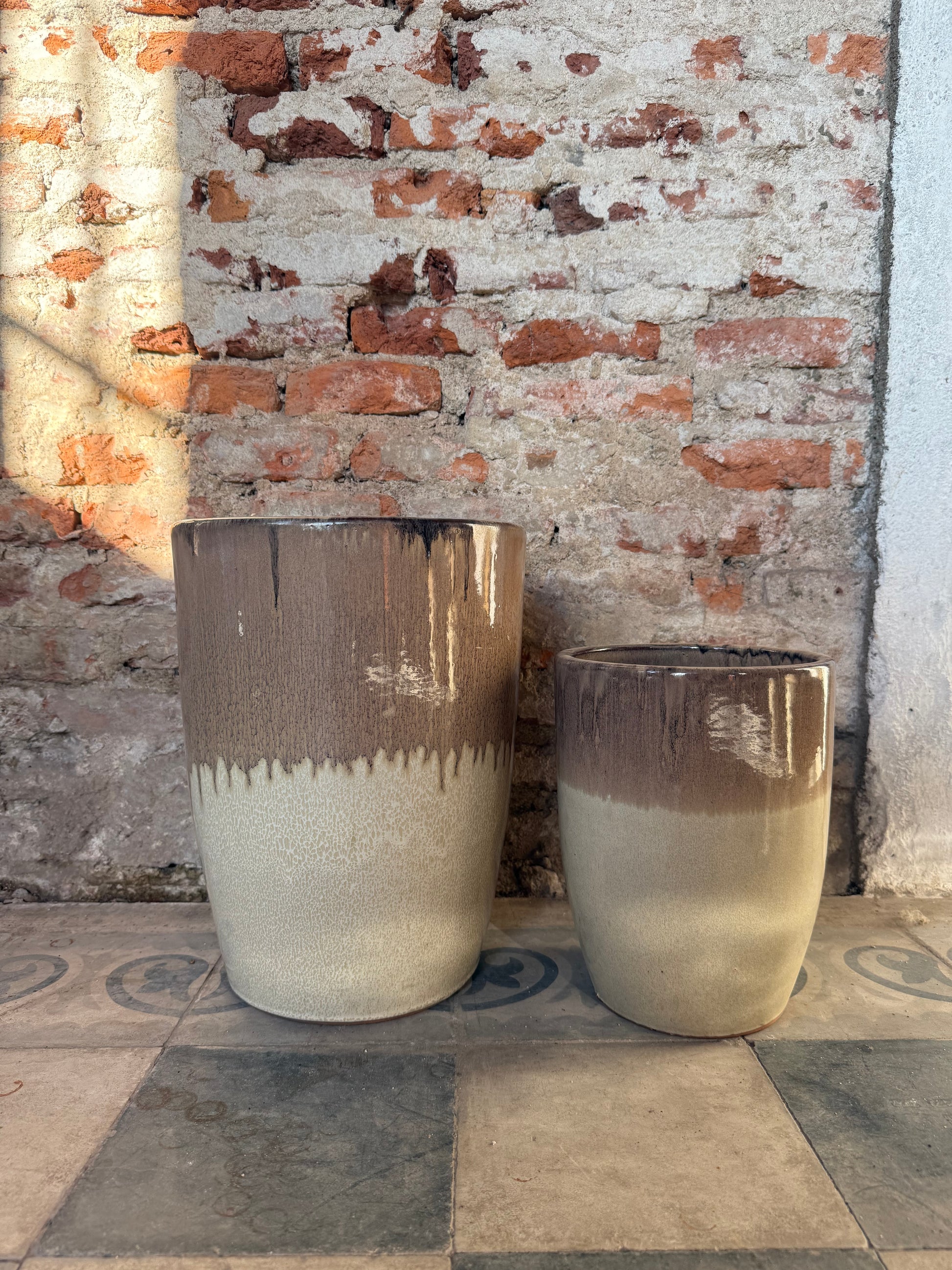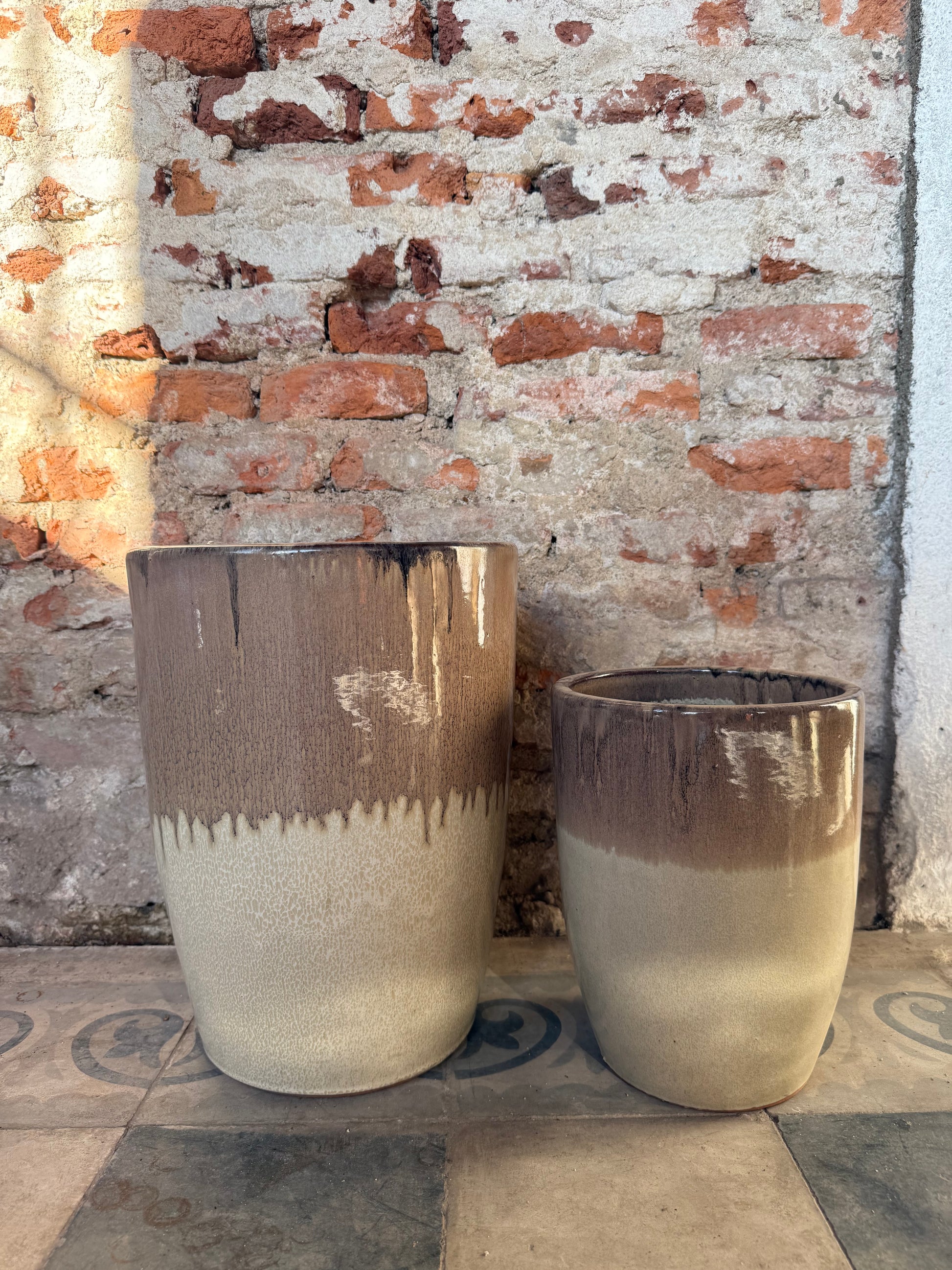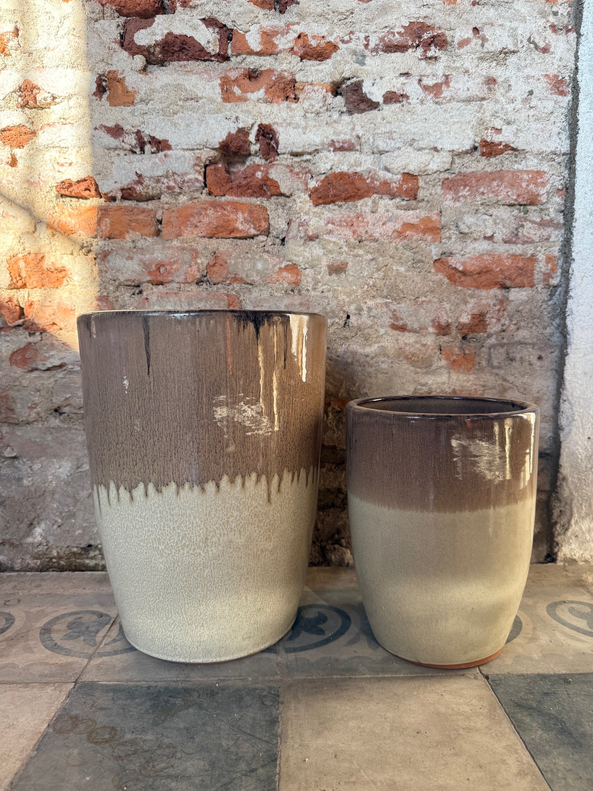 Macetas de cerámica en acabado degradado beige y gris oscuro, con un diseño sobrio y moderno que combina fácilmente con cualquier ambiente. Ideales para interiores y exteriores, aportan un toque sofisticado y natural a tus plantas favoritas.