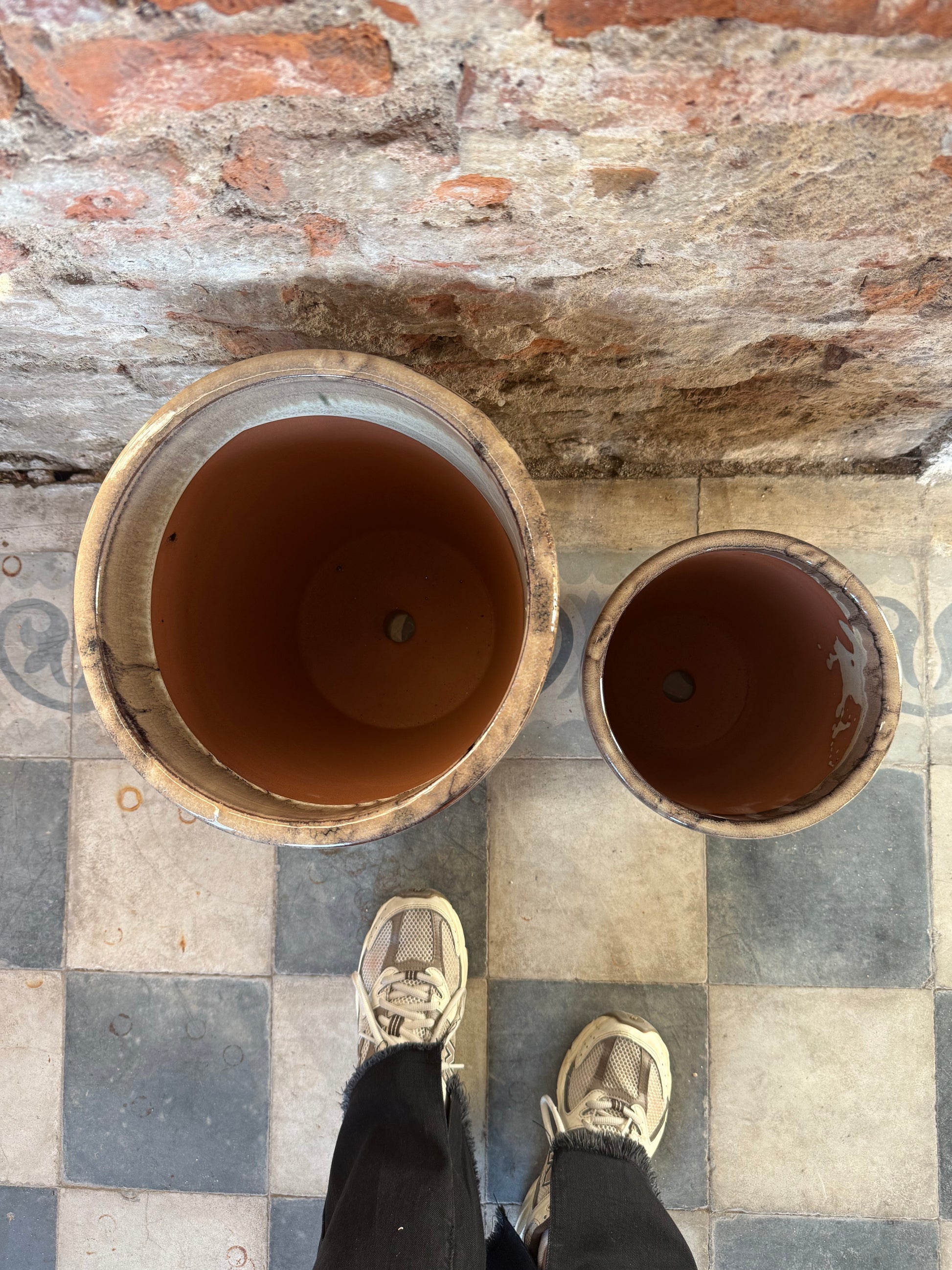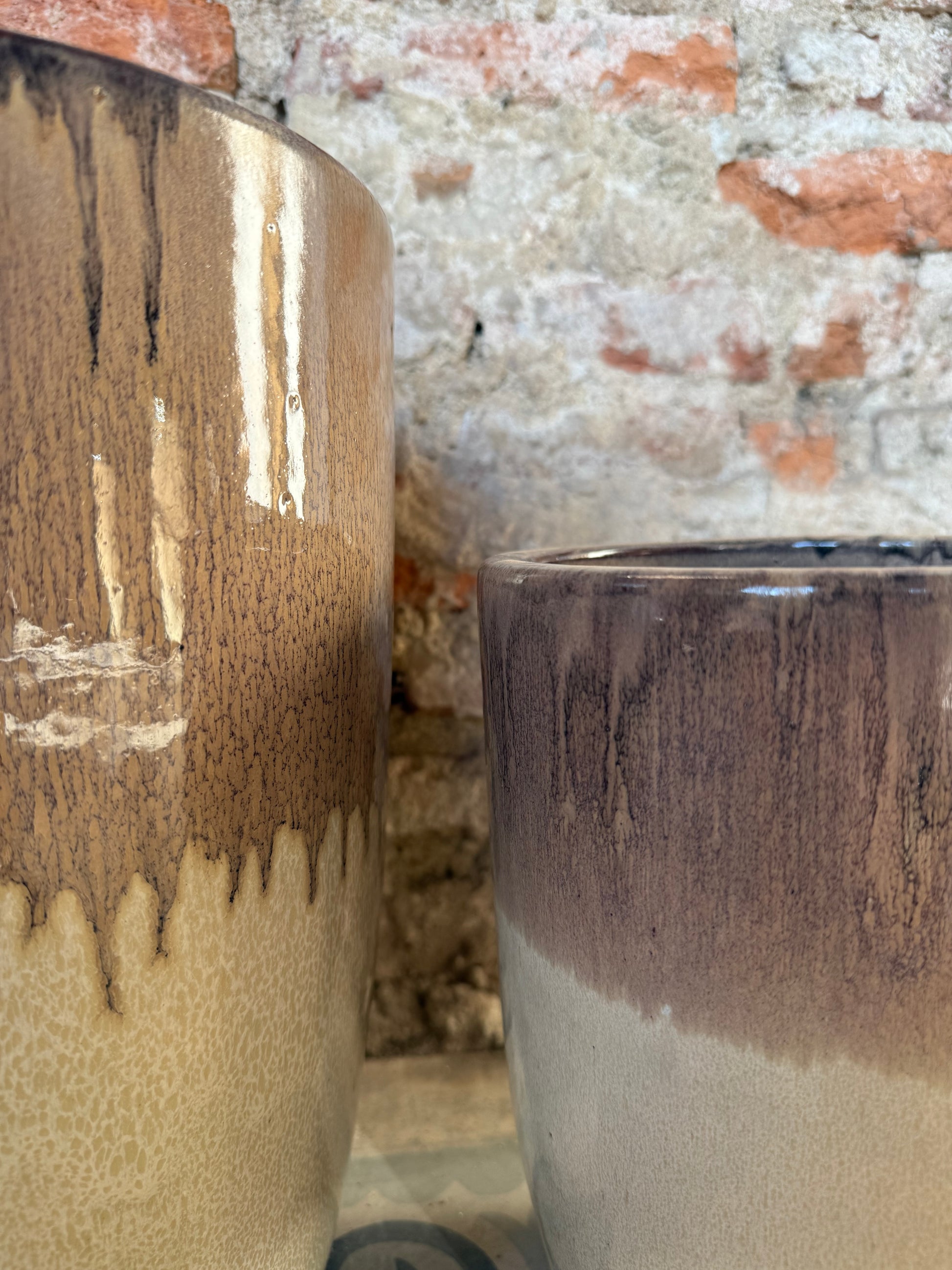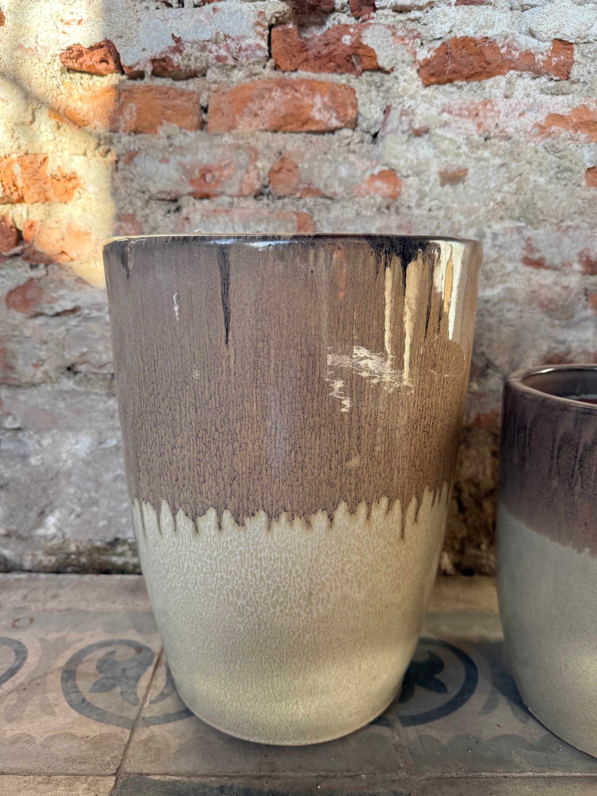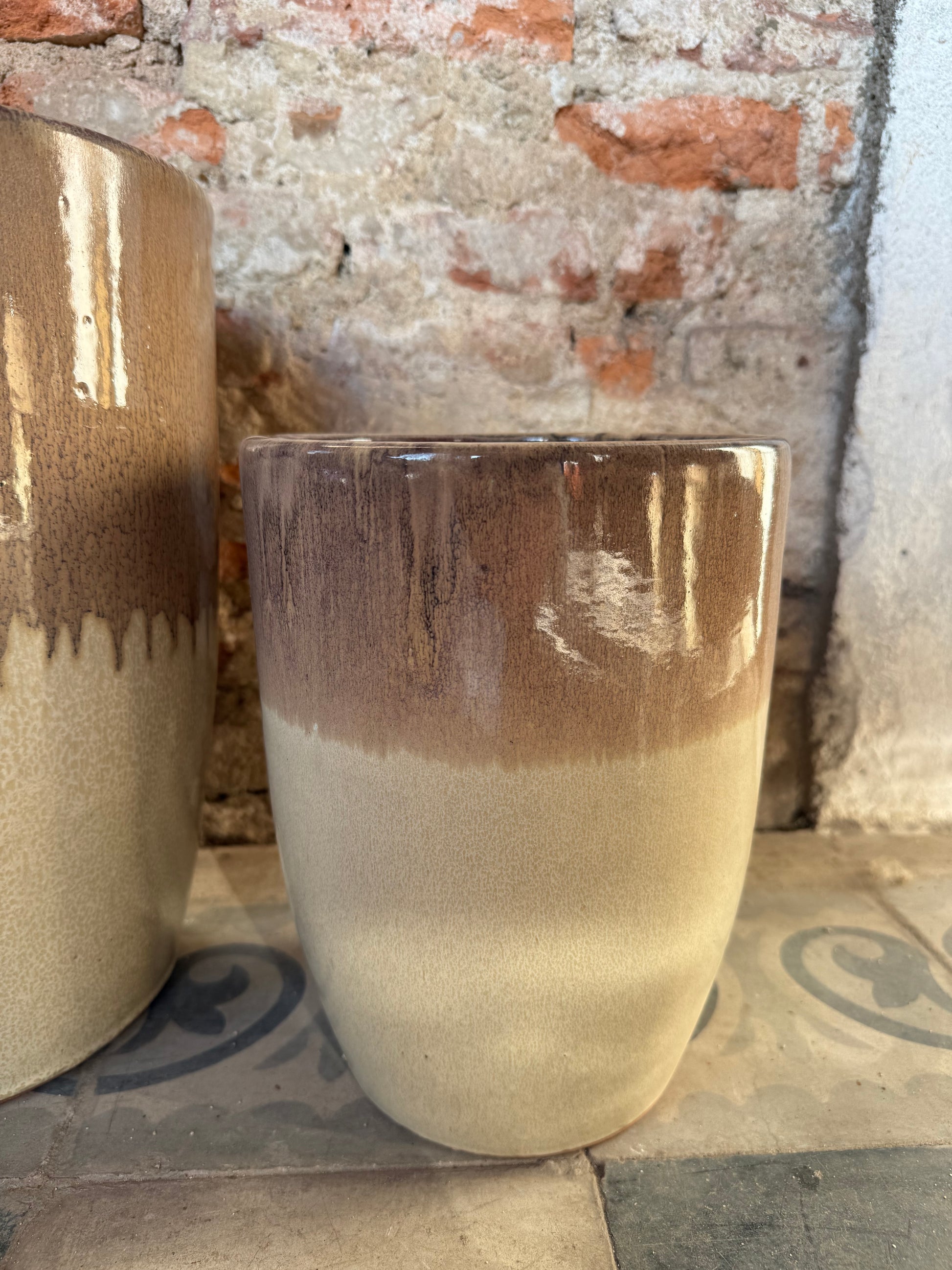 Macetas de cerámica en acabado degradado beige y gris oscuro, con un diseño sobrio y moderno que combina fácilmente con cualquier ambiente. Ideales para interiores y exteriores, aportan un toque sofisticado y natural a tus plantas favoritas.